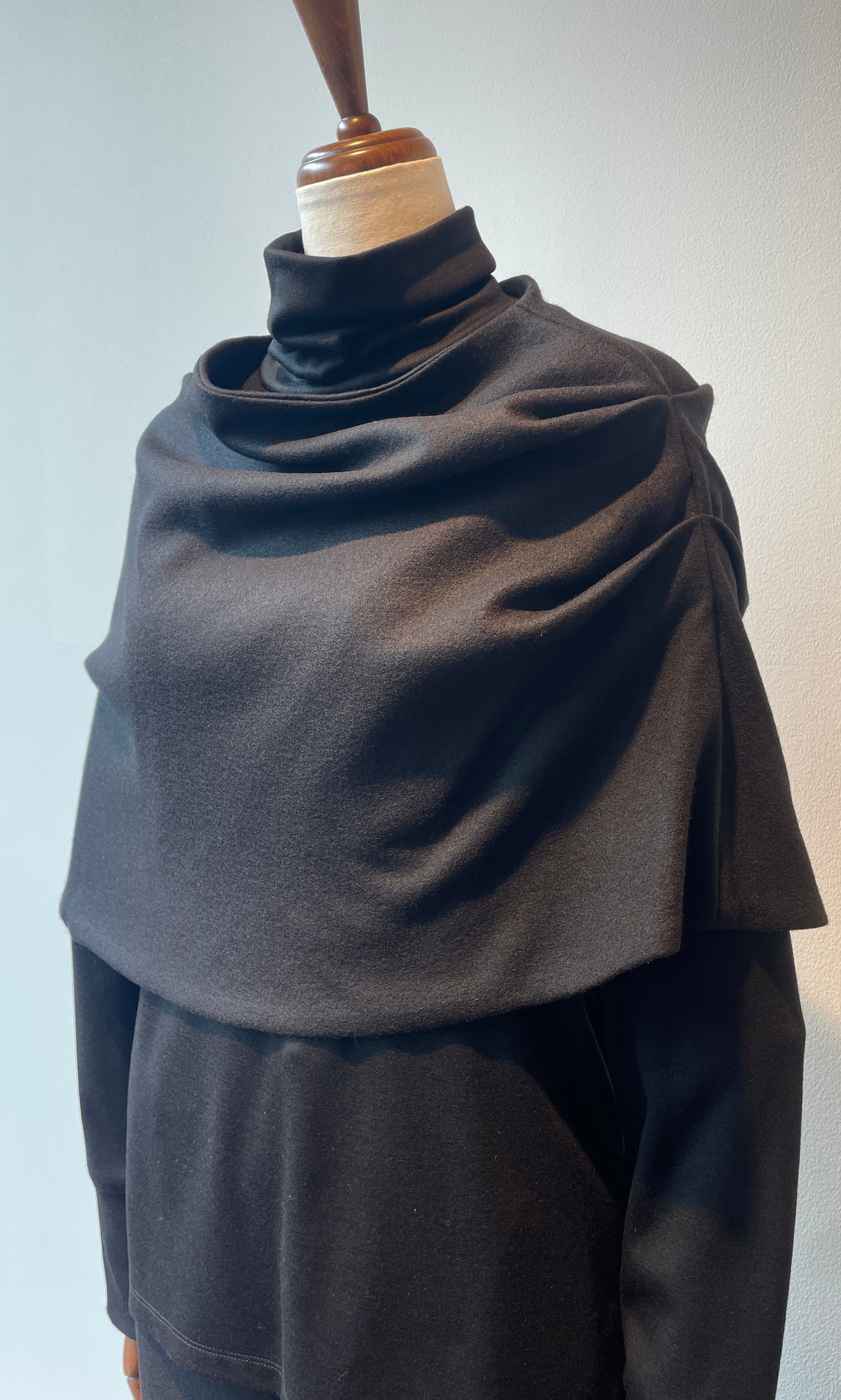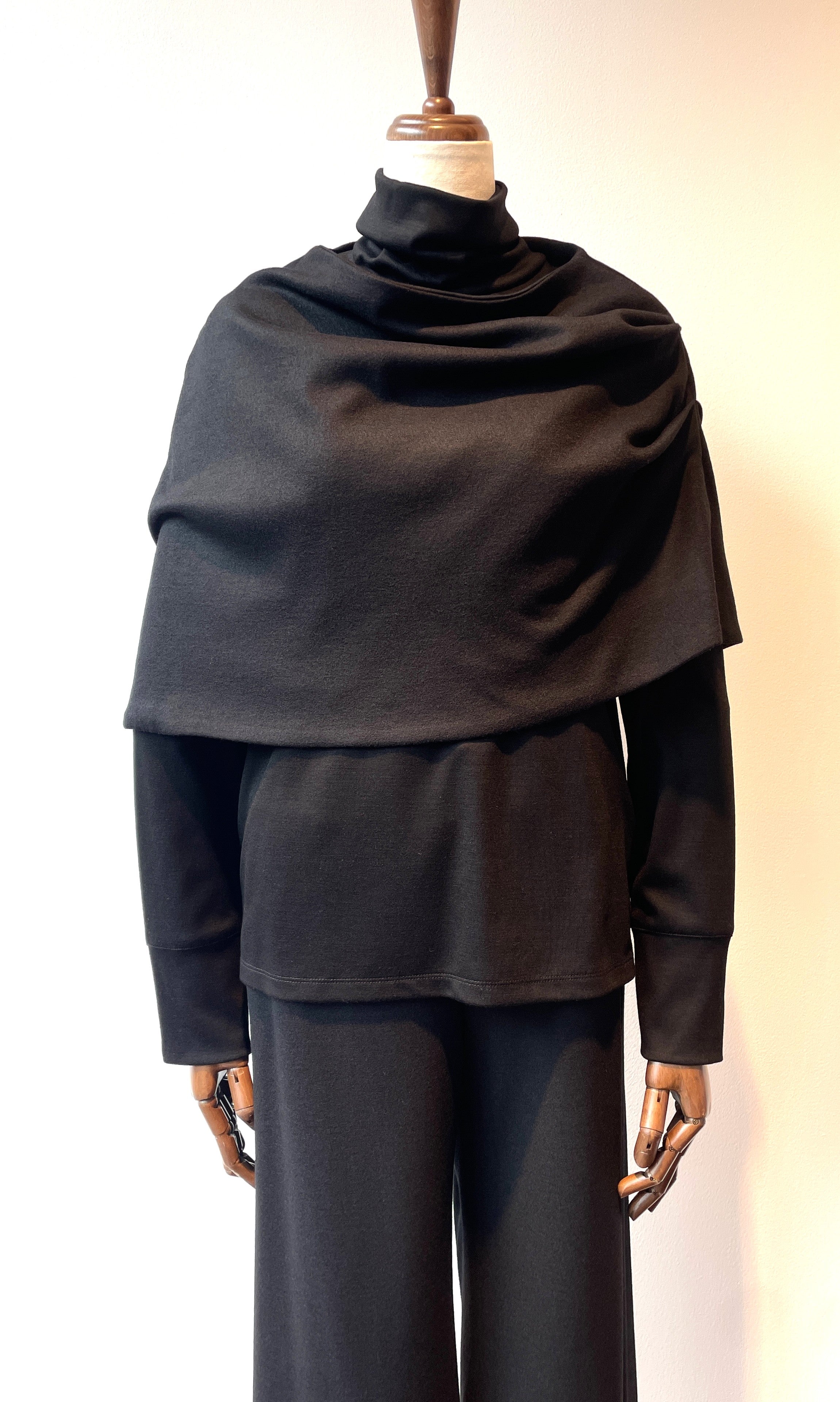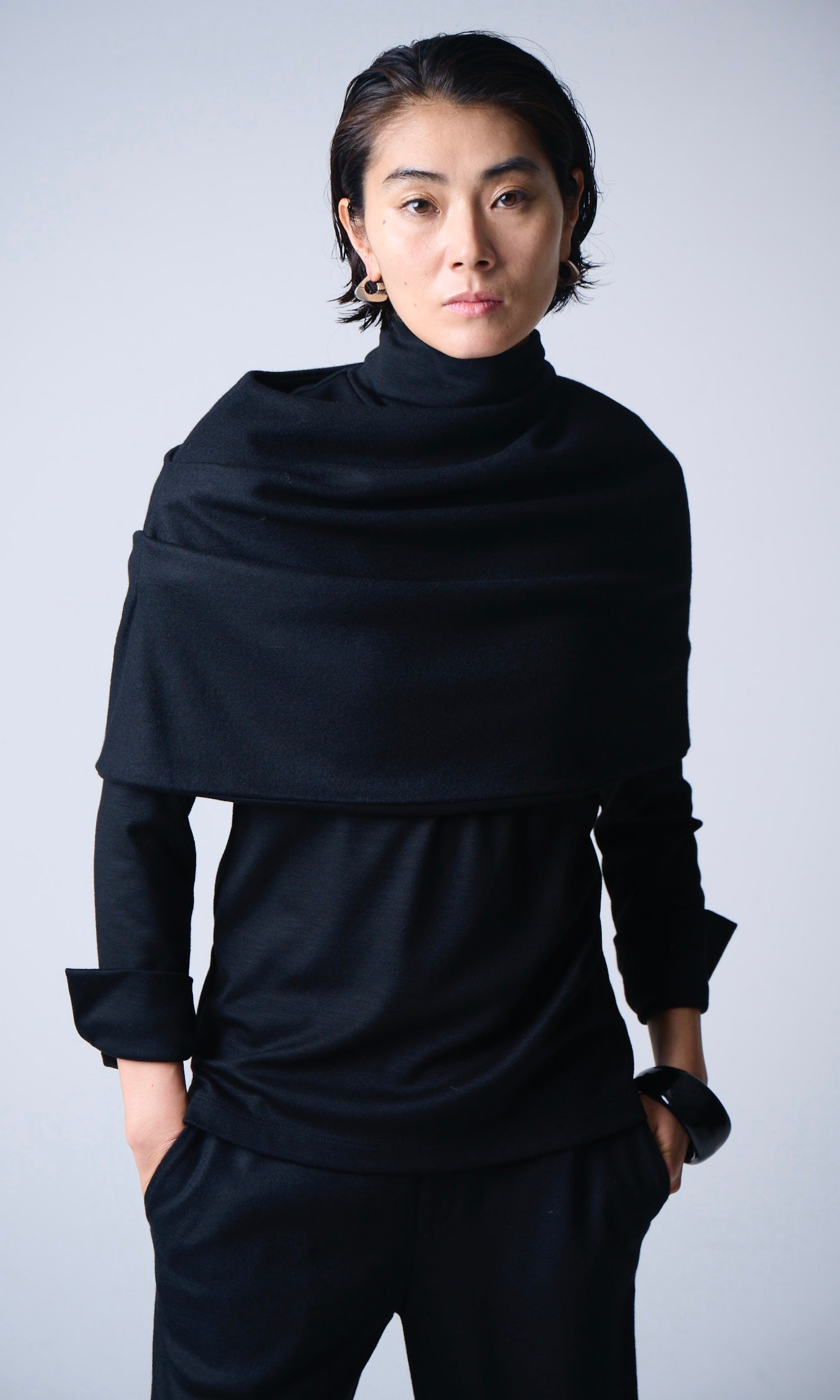 また、スヌードとタートルネックの素材は厚みに微妙に差のある素材を使い分けており、重ねた時にゴワつかず着ていただけます。
