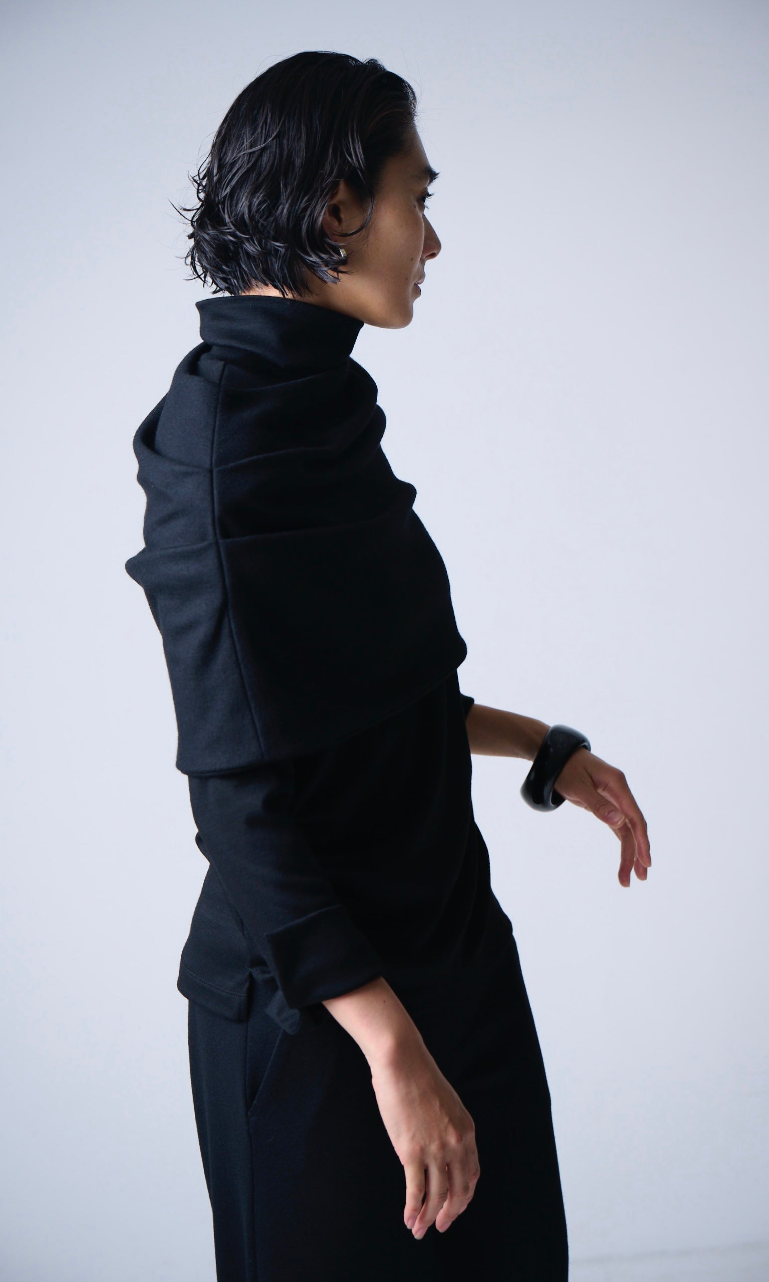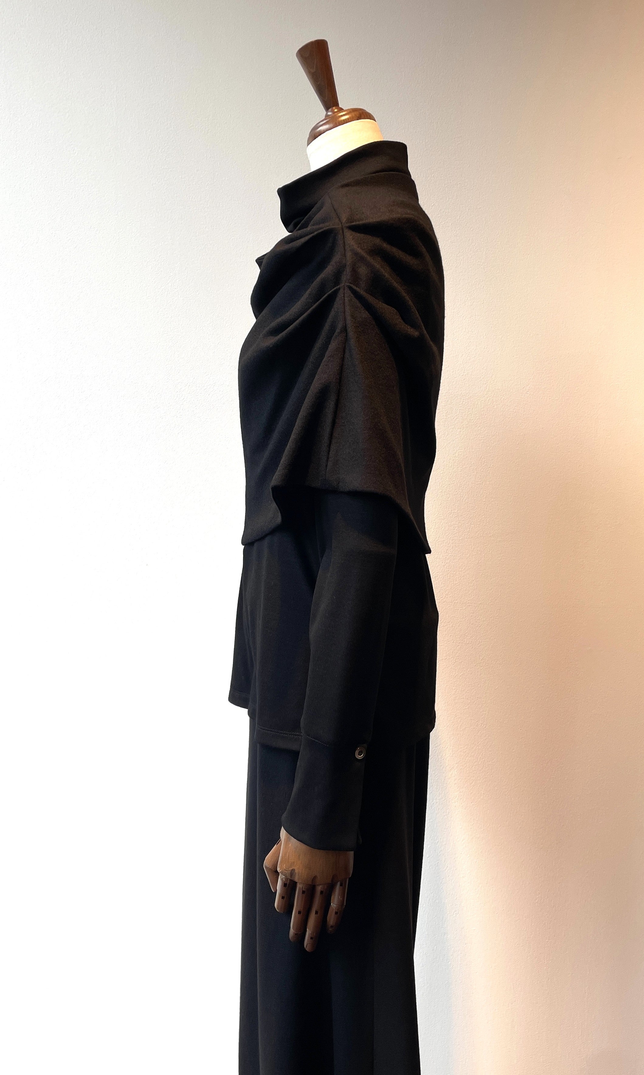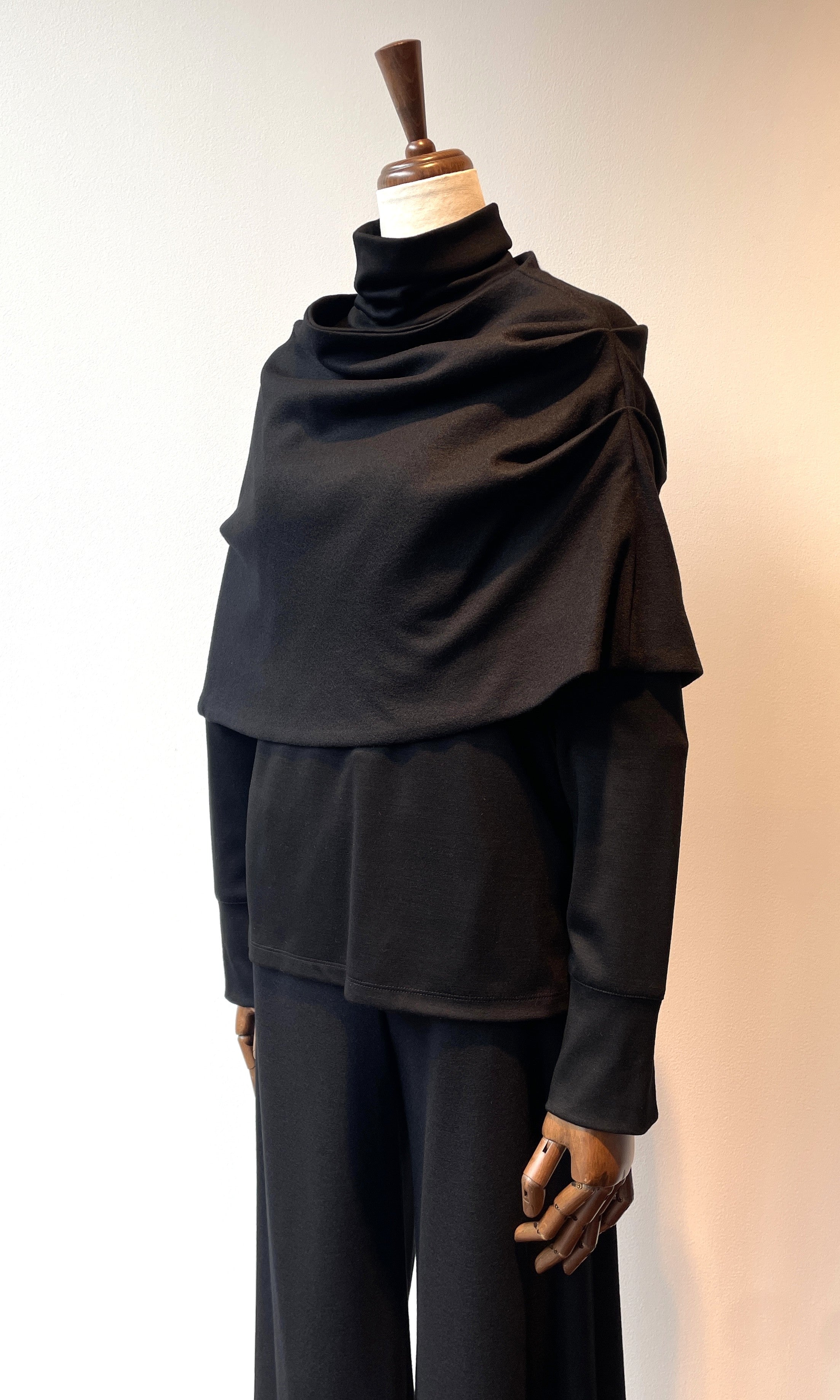 また、スヌードとタートルネックの素材は厚みに微妙に差のある素材を使い分けており、重ねた時にゴワつかず着ていただけます。