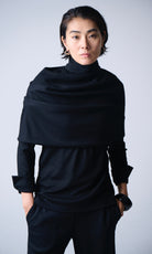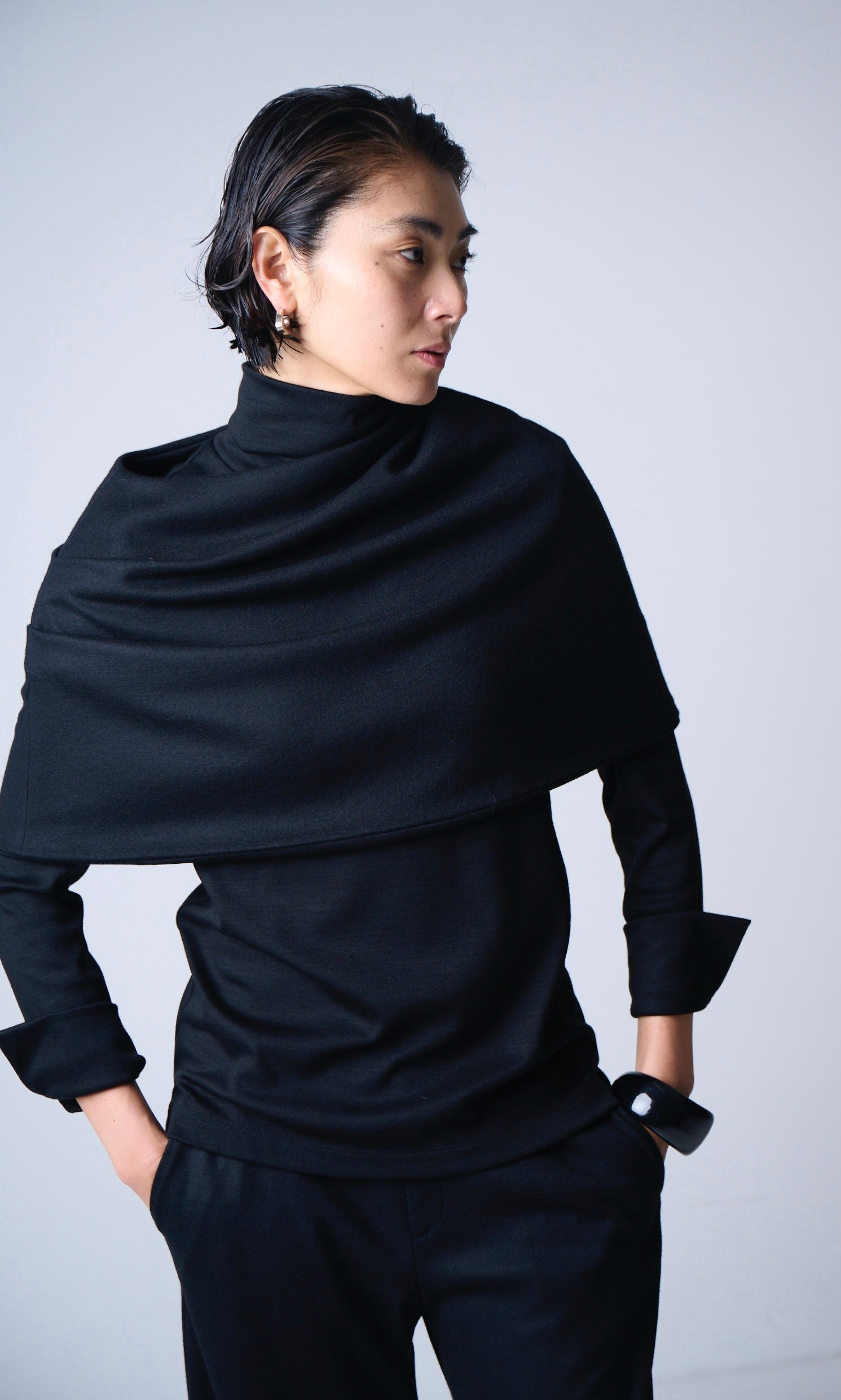 取り外し可能なスヌードがセットになったカットソー。スヌードはネックラインがアシンメトリーなデザイン。きちんと整えて上品にまとめたり、くしゃっとラフに着てニュアンスを楽しむなど、アレンジ次第で表情の変化をお楽しみいただけます。