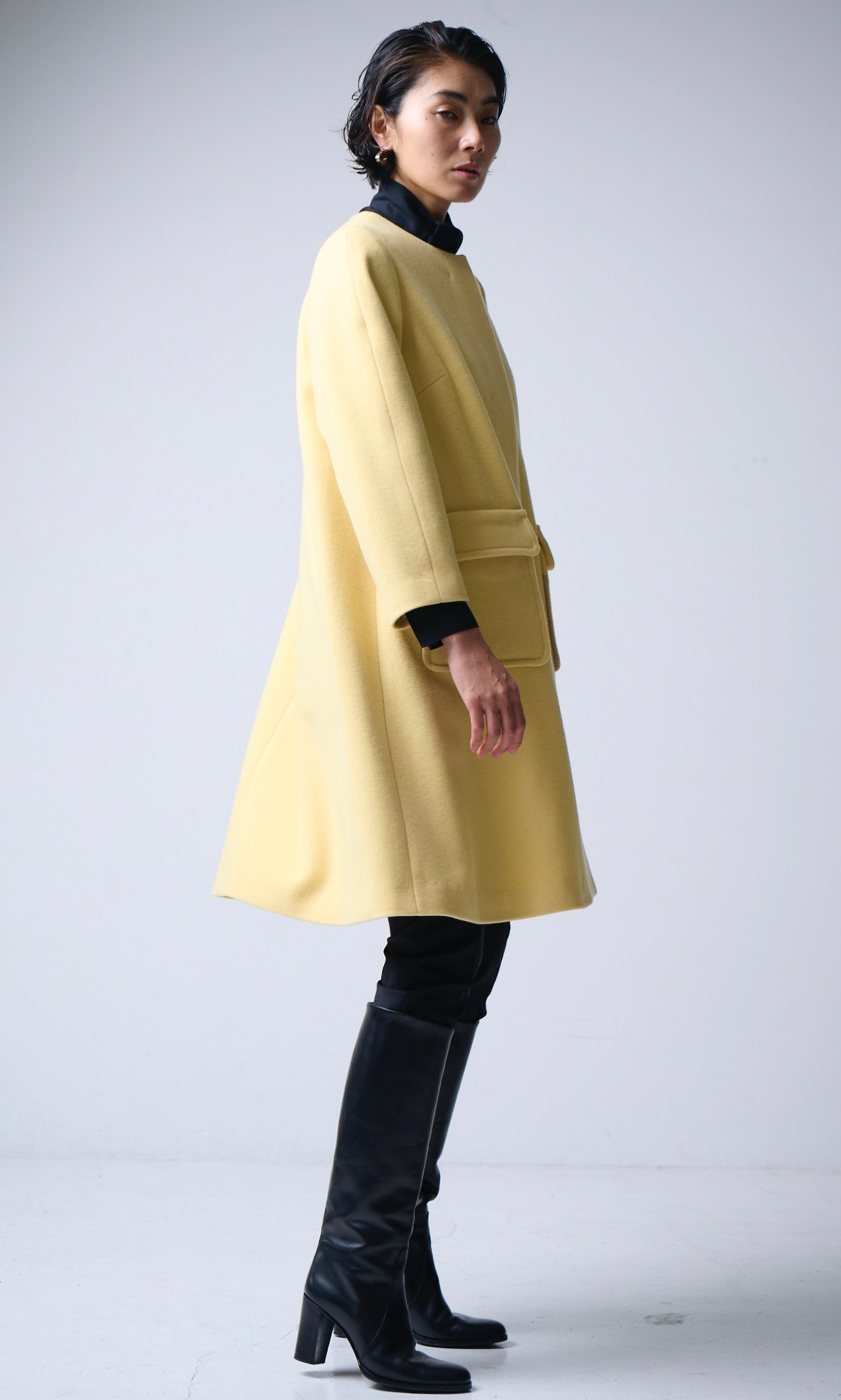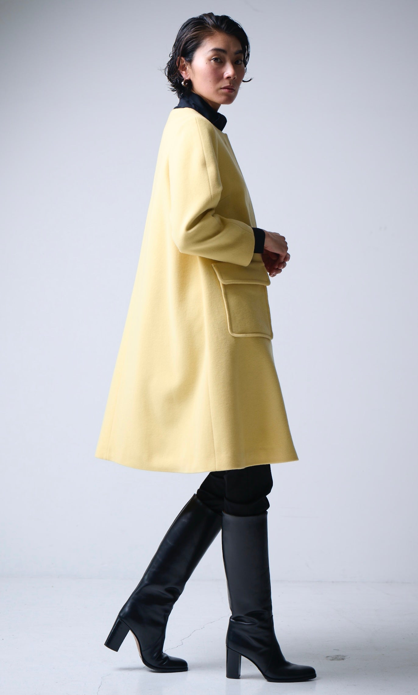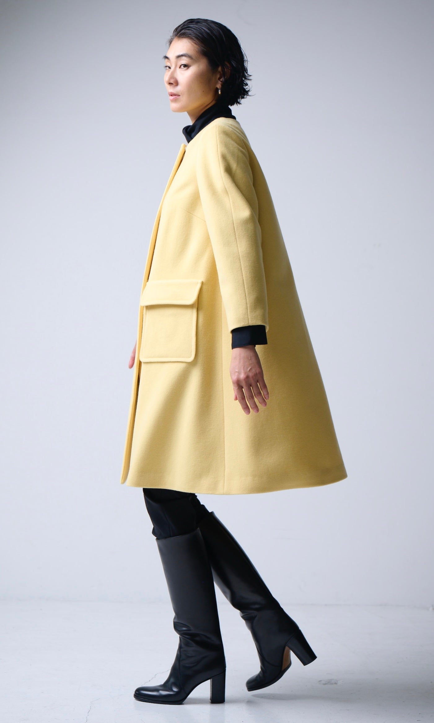 今シーズンのカラーコートは淡いイエロー。丸みのある袖のフォルムと存在感のあるフラップ付ポケットデザインでグレードアップしています。