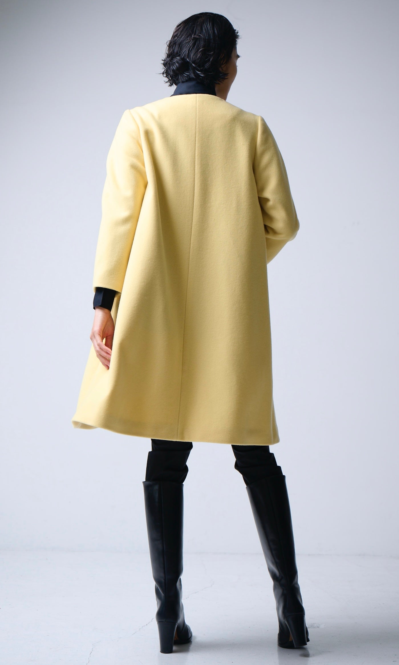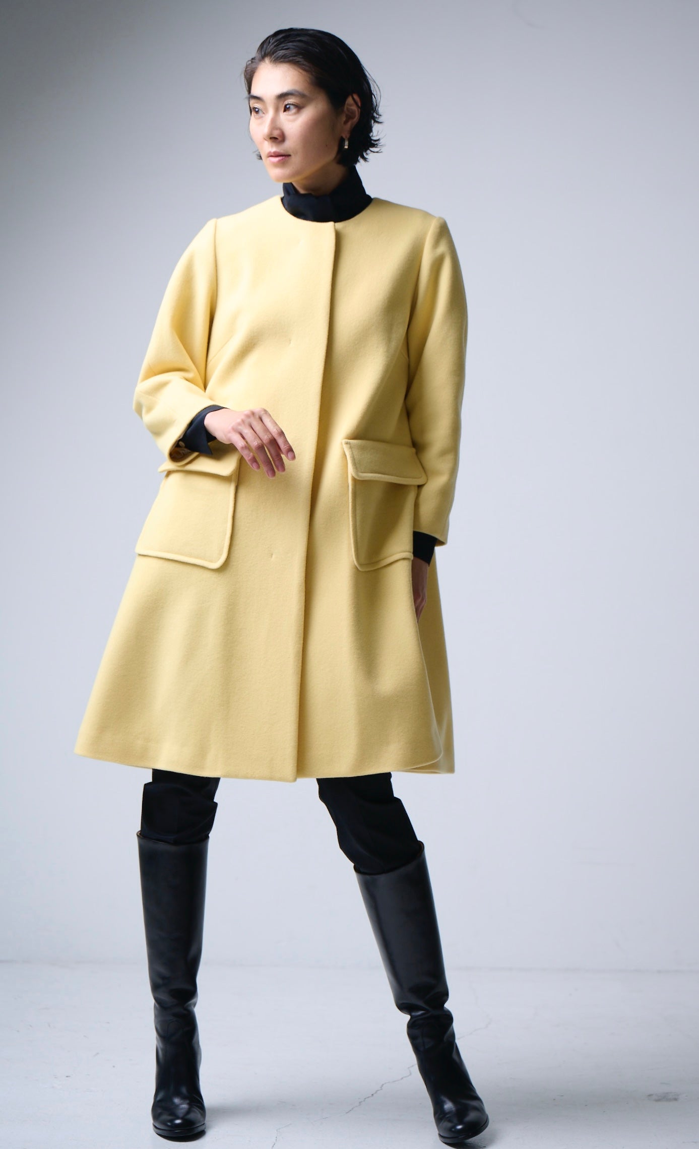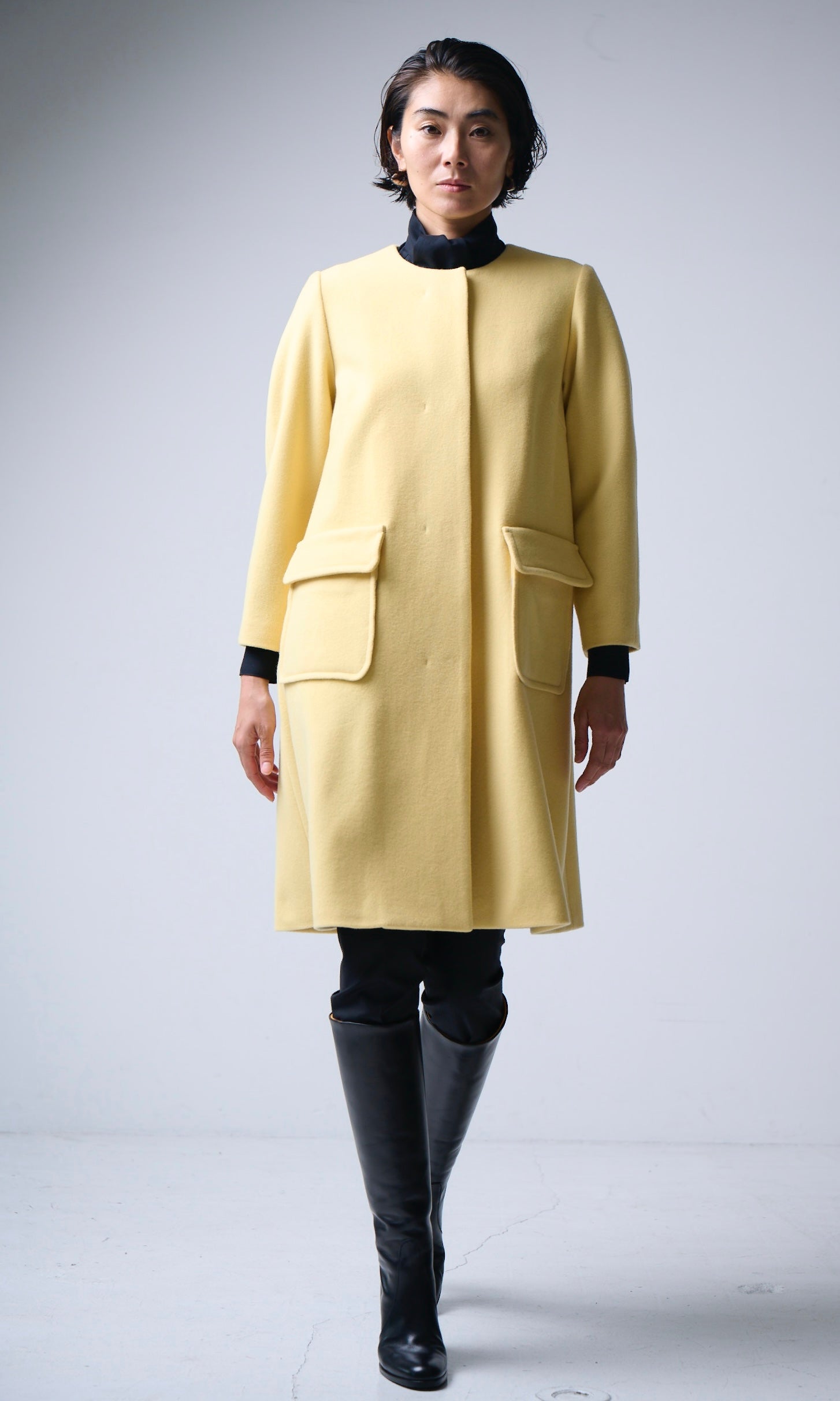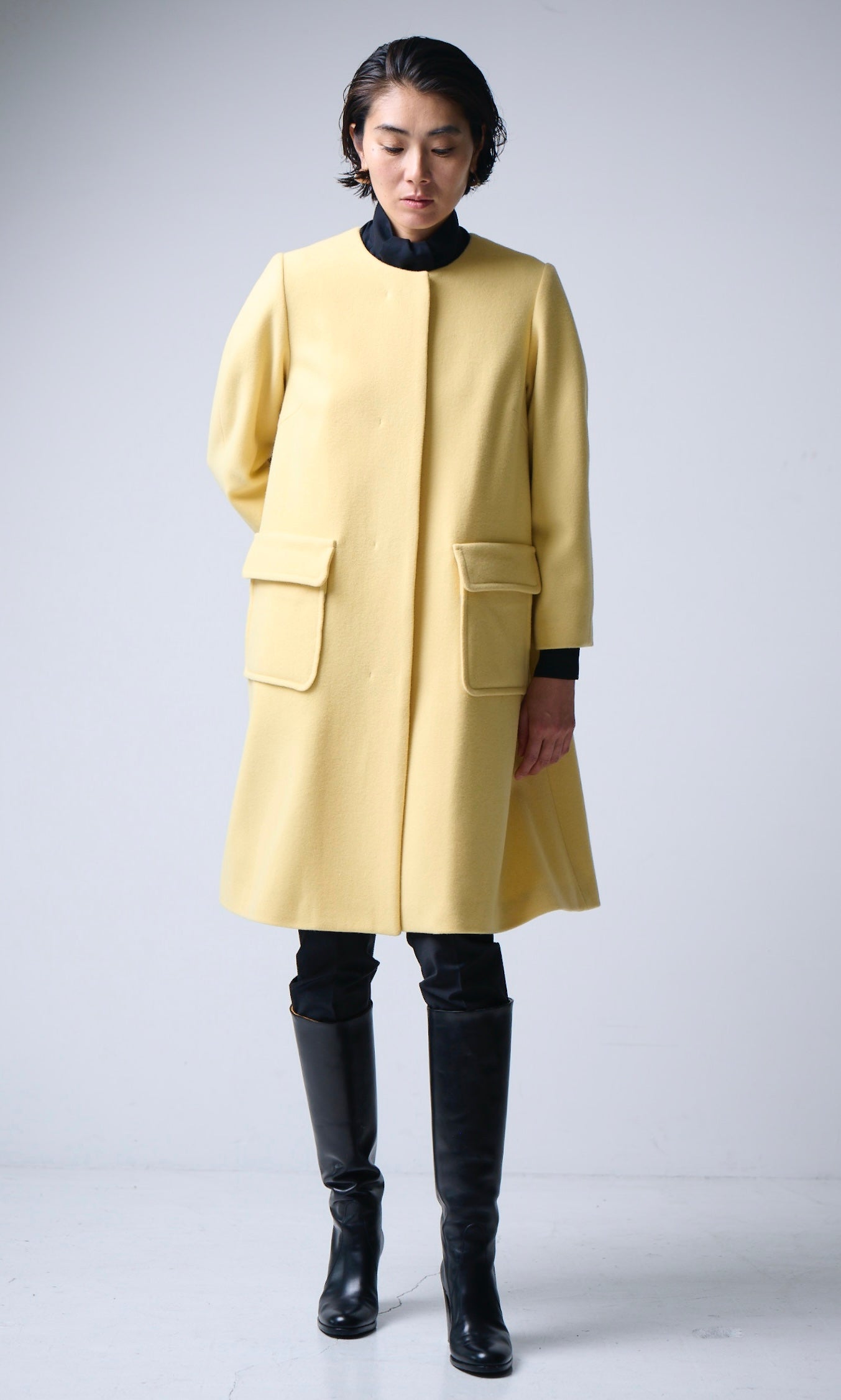 今シーズンのカラーコートは淡いイエロー。丸みのある袖のフォルムと存在感のあるフラップ付ポケットデザインでグレードアップしています。