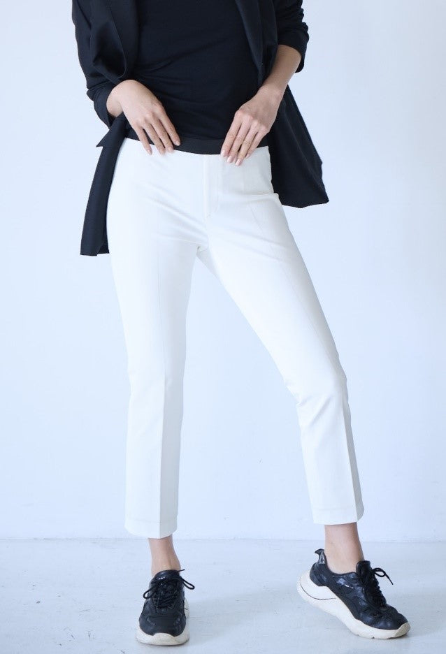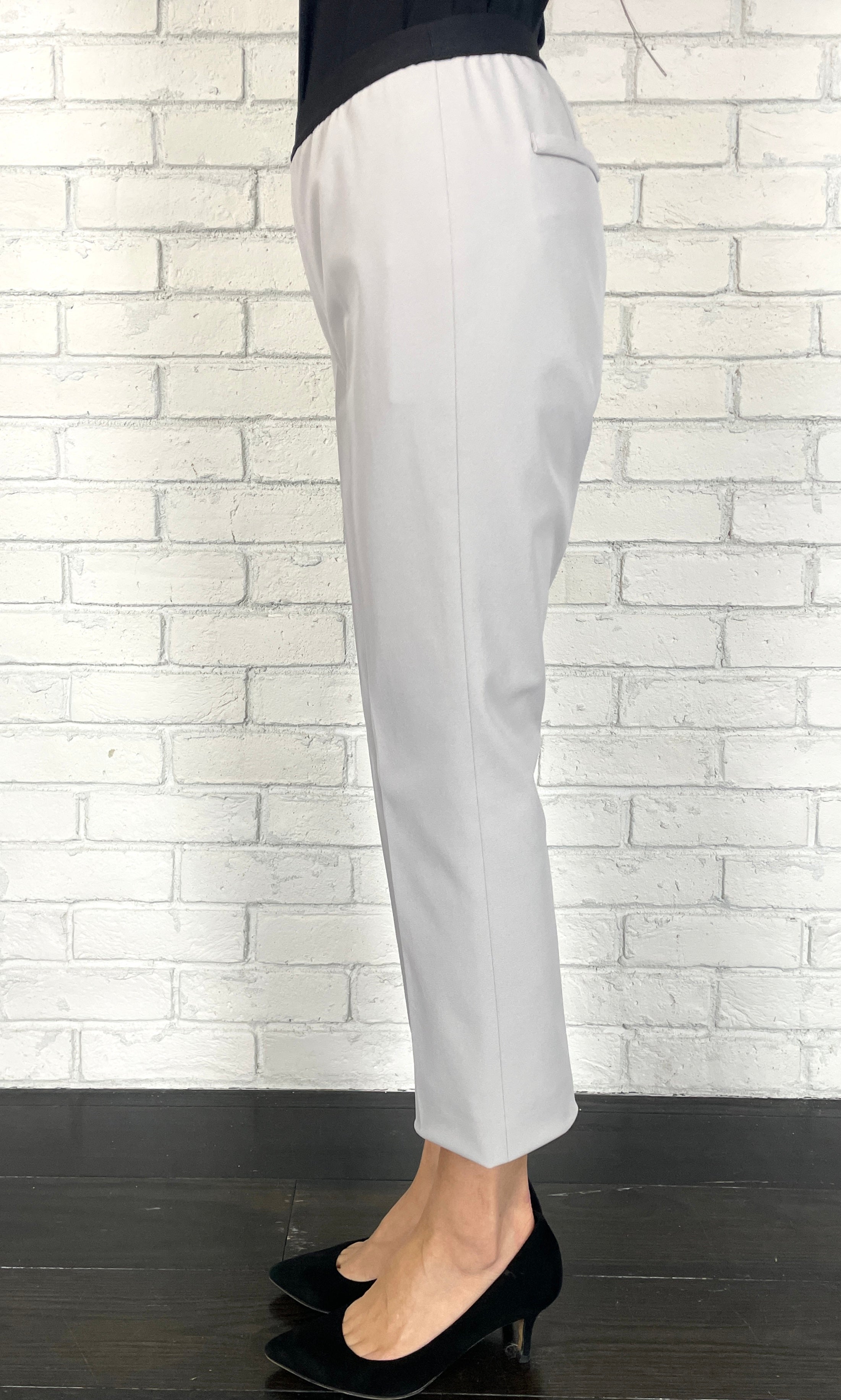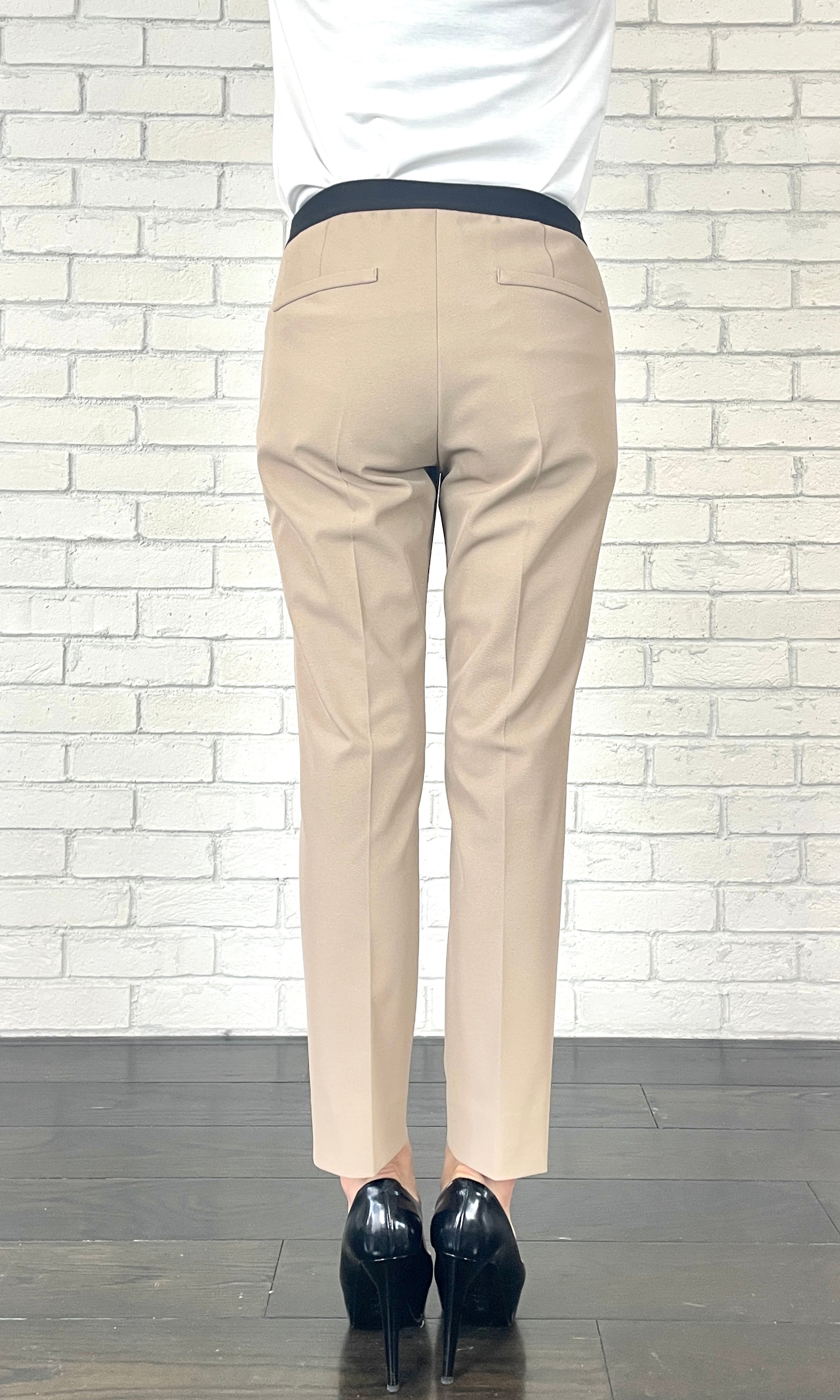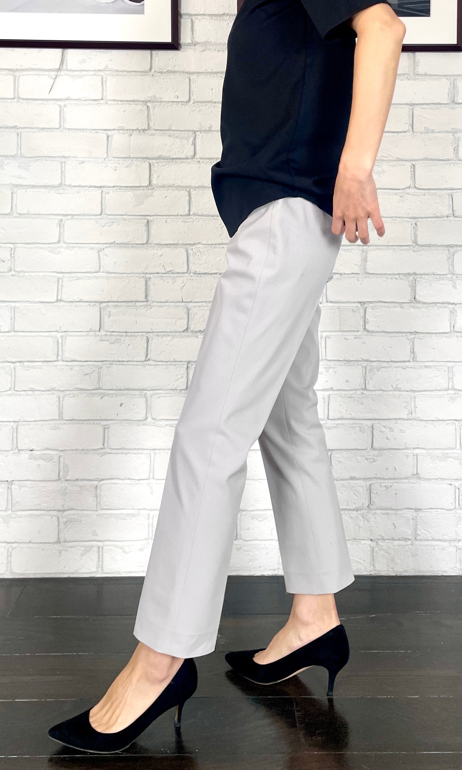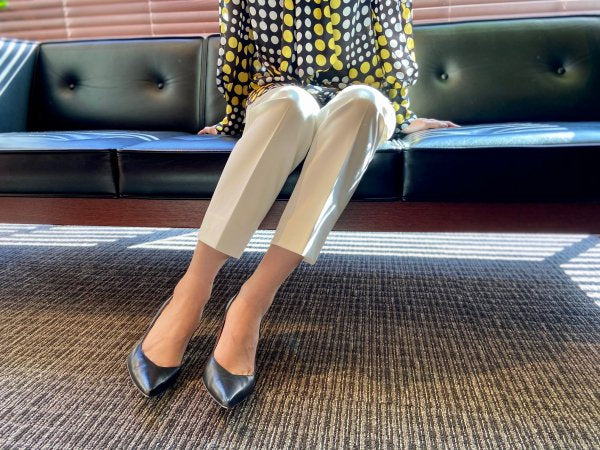 素材は脚のラインが出ず、下着も透けにくいように工夫された「ボディシェル」と呼ばれる生地です。 地厚でしっかりとしていながら、適度なストレッチ性を実現。また、防汚効果も高い所も魅力です。 一年を通してお召いただける素材です。