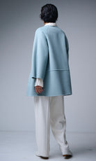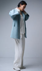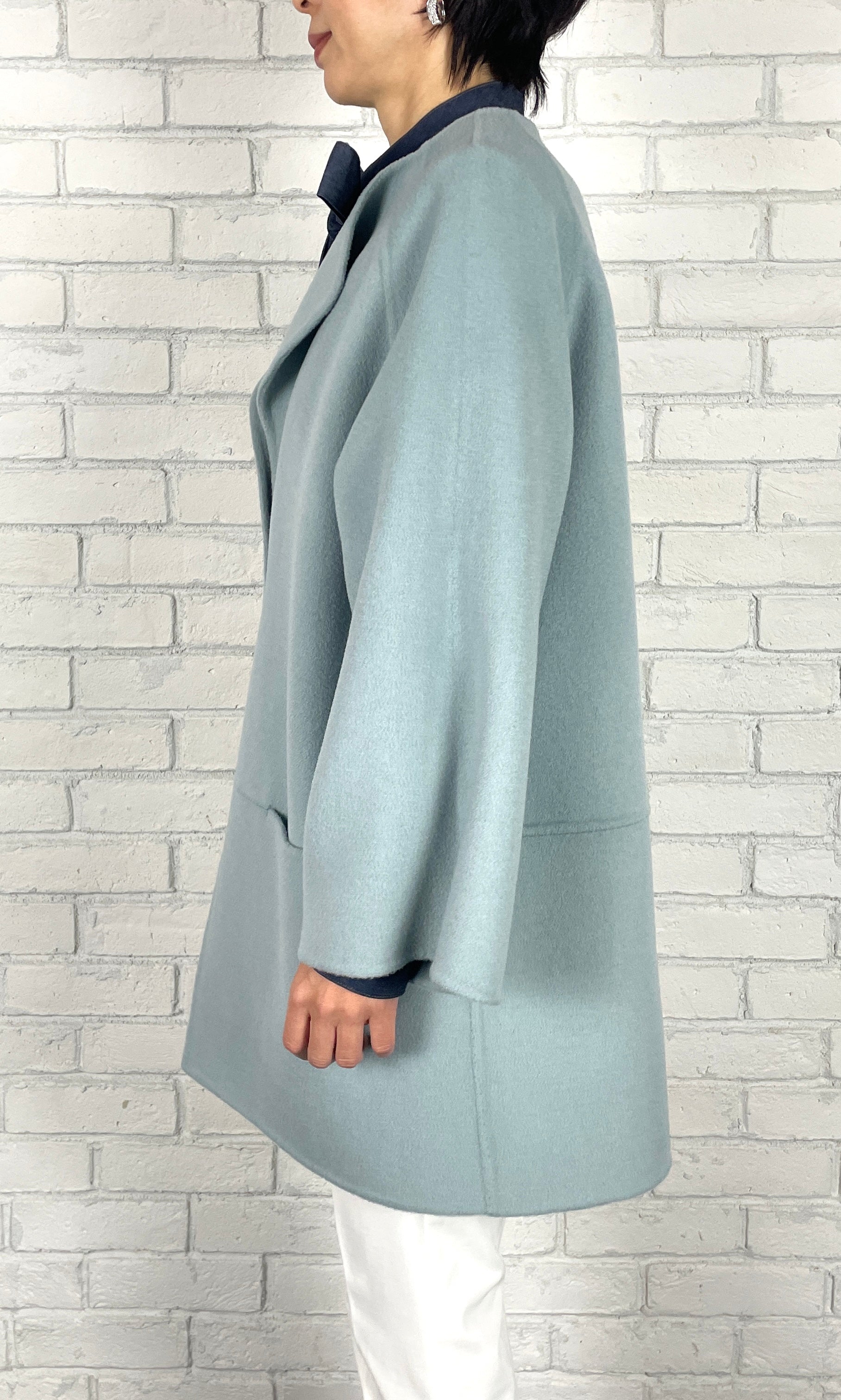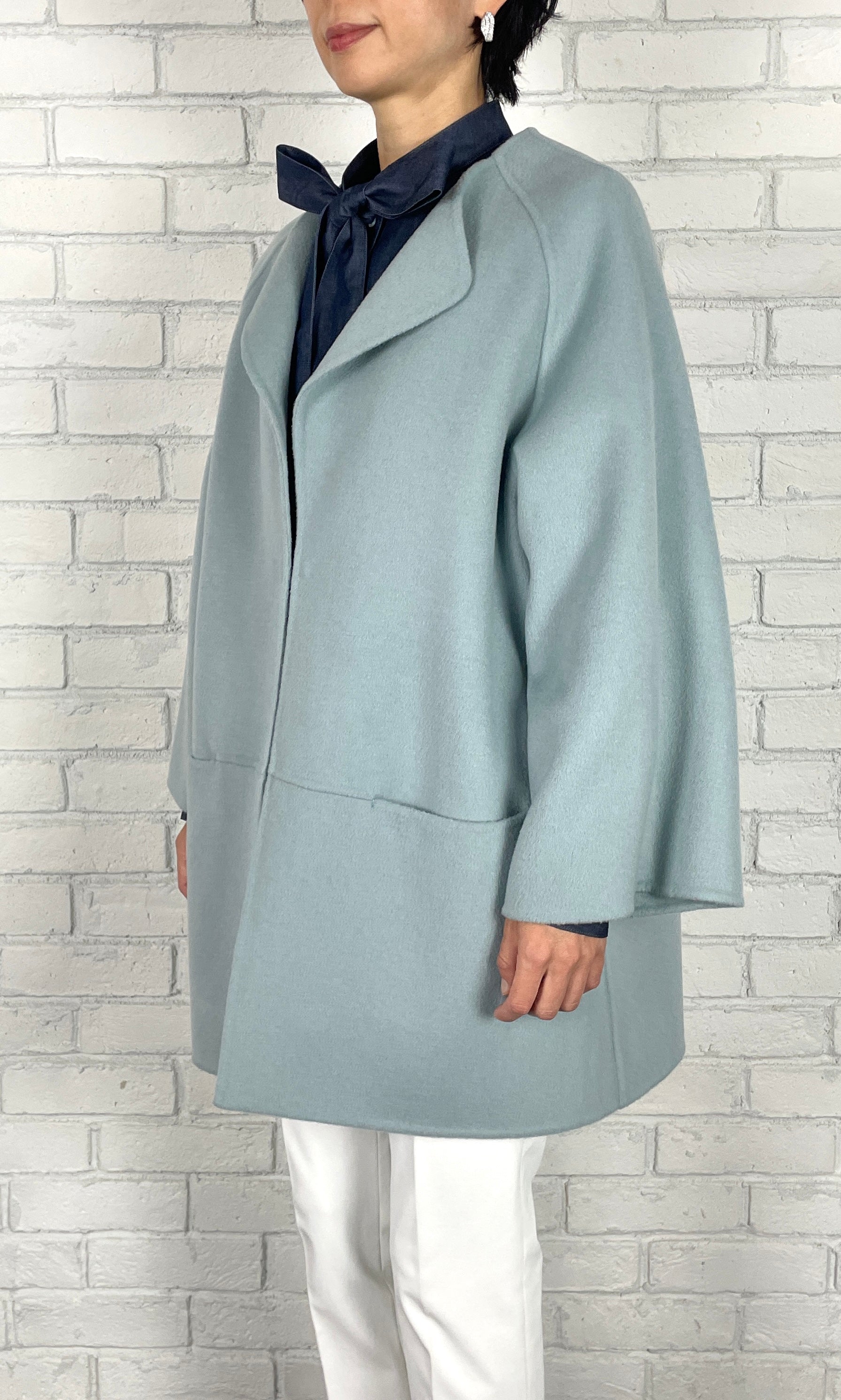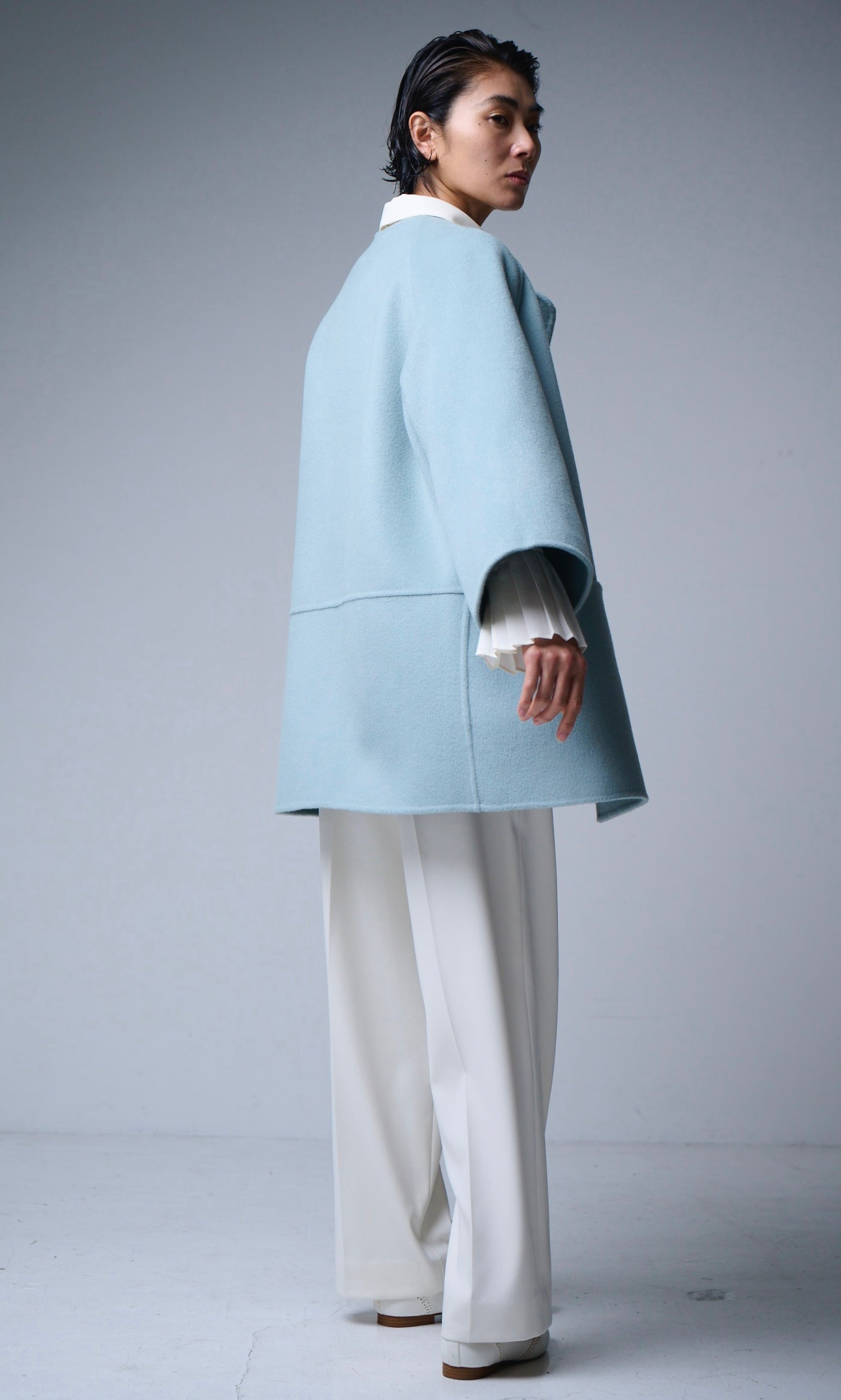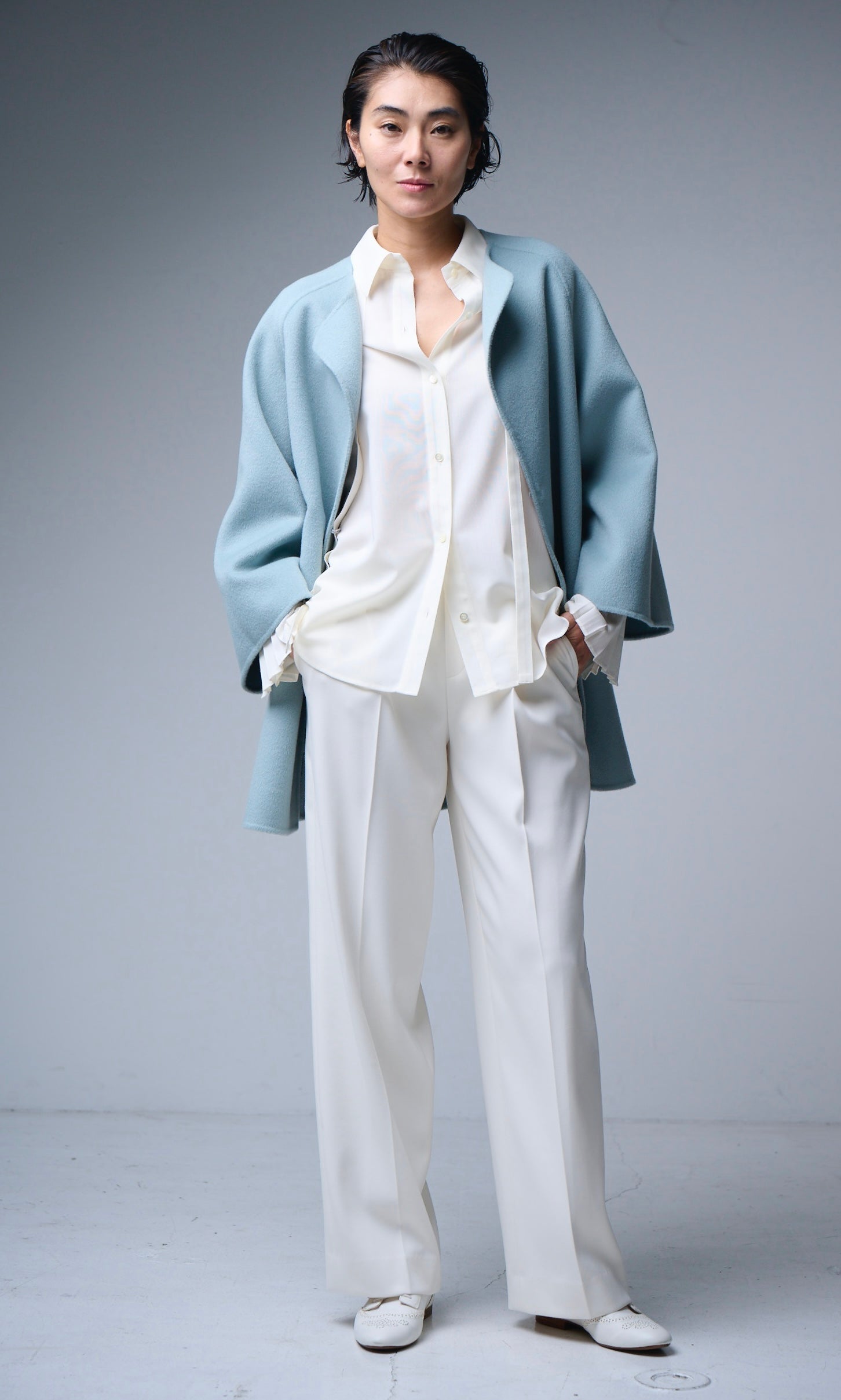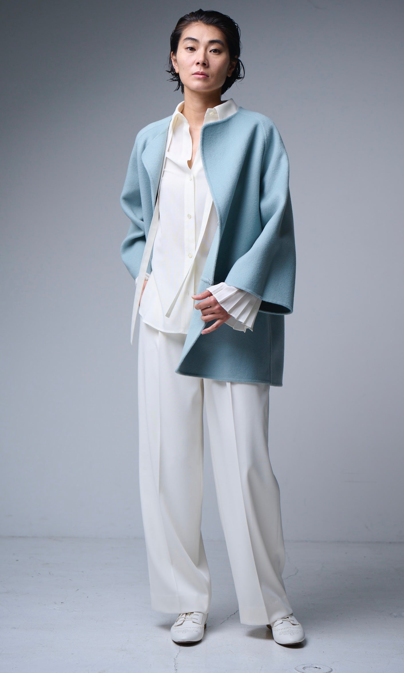 ゆったりとしたサイズ感で、インナーのボリュームを気にせずに着ていただけるリバーコート。かしこまりすぎないラペルのデザインは、お顔周りに華やかさをプラスしてくれます。