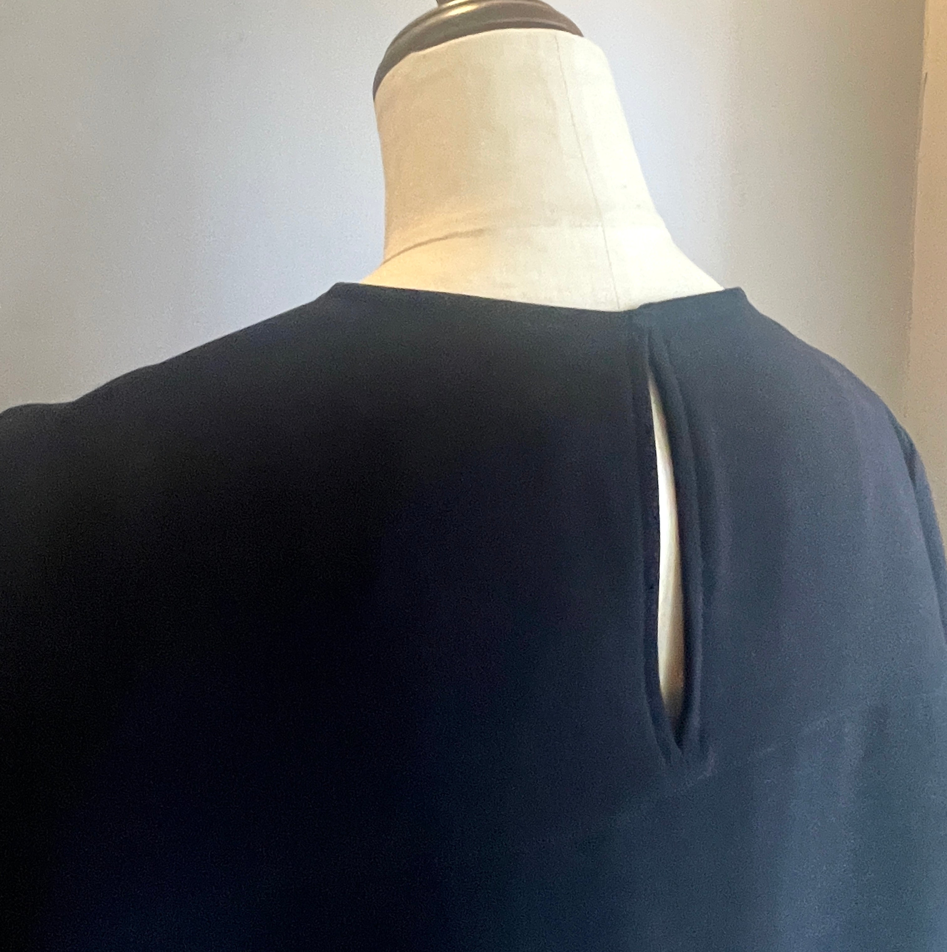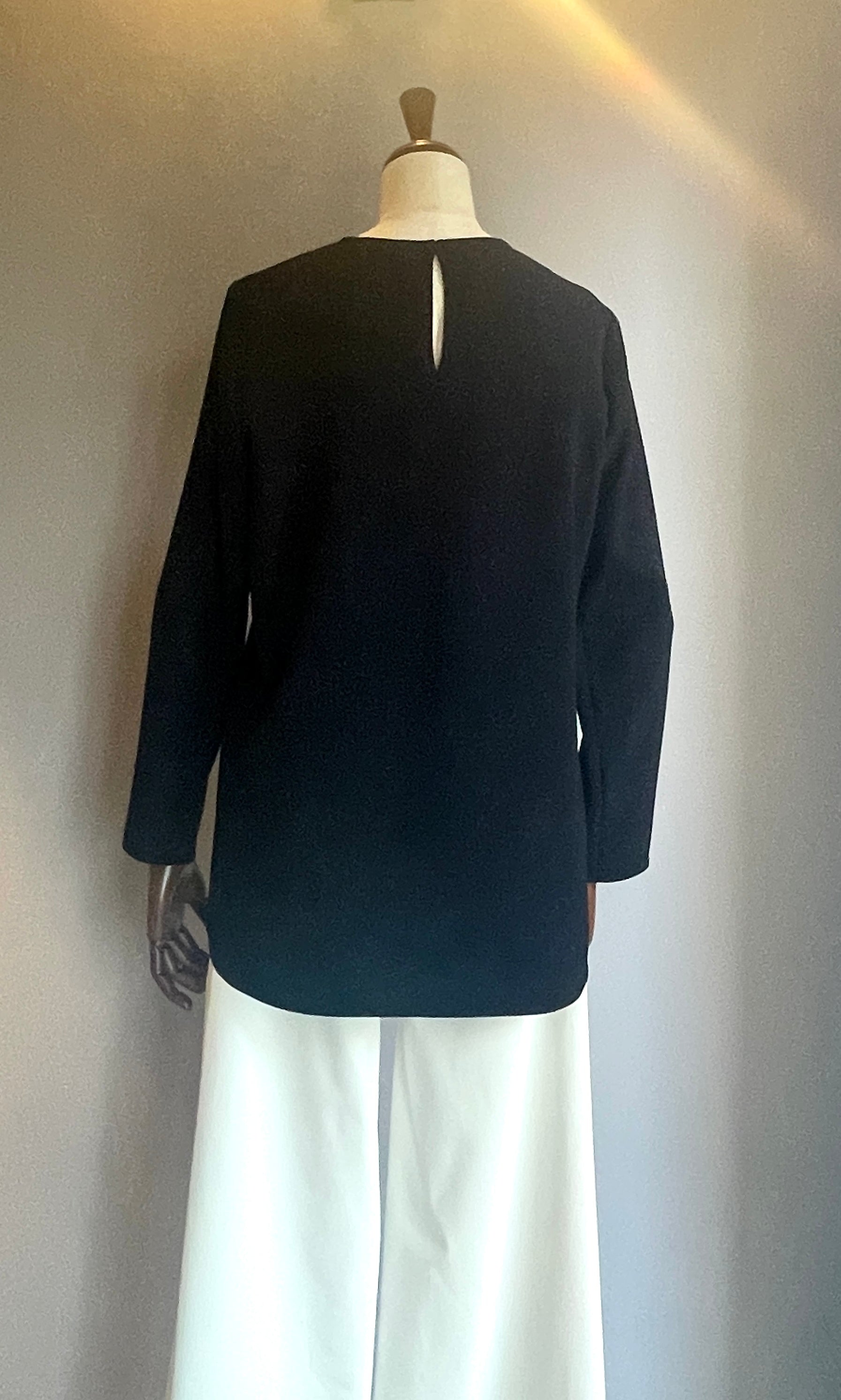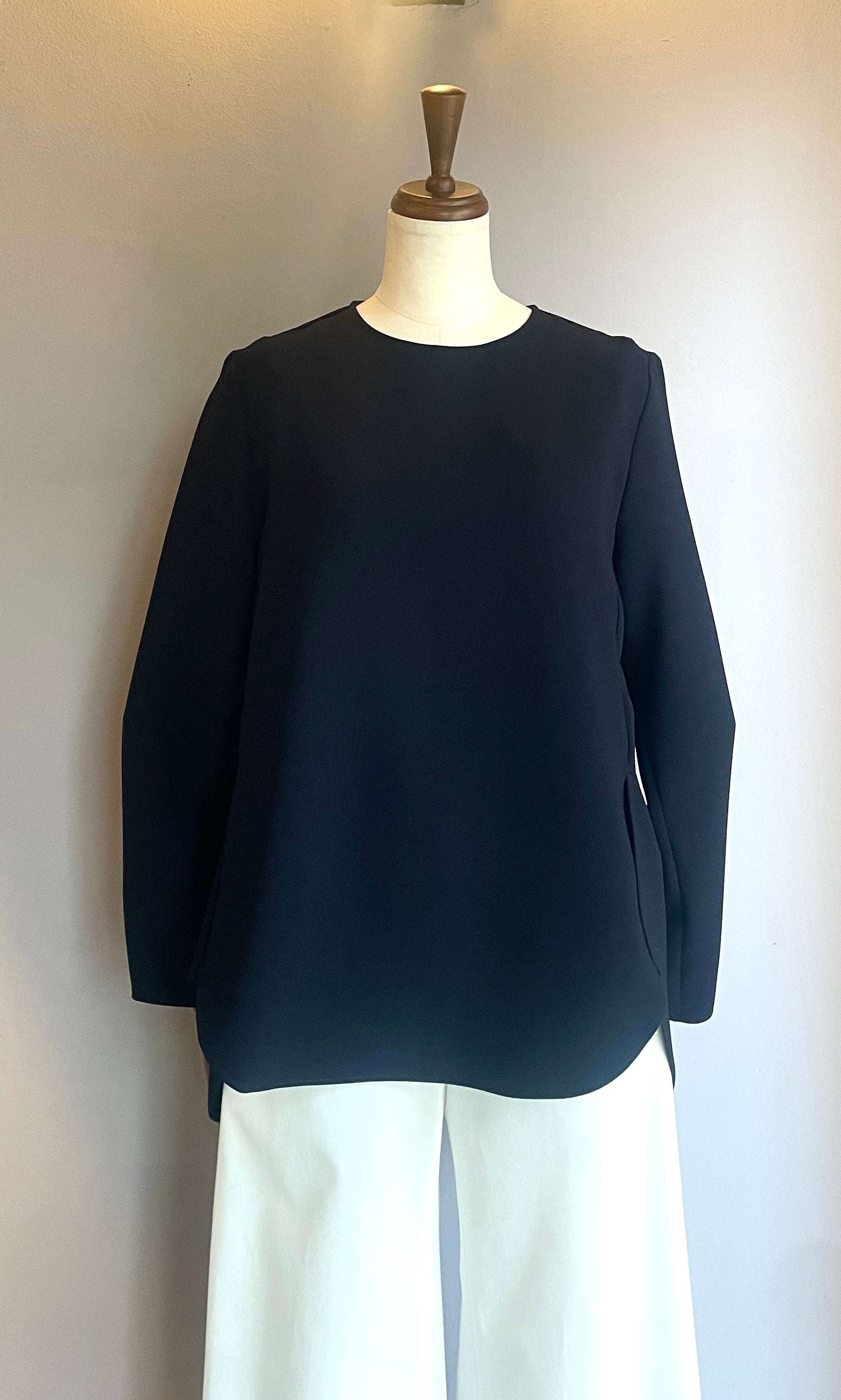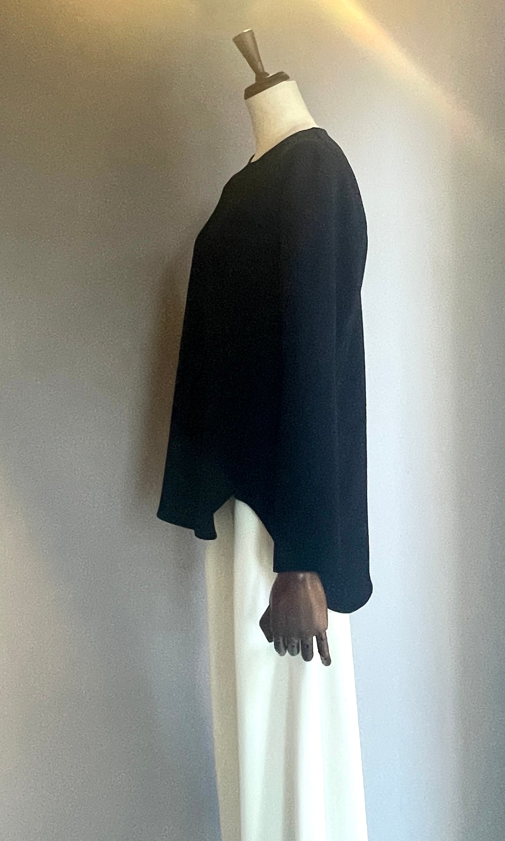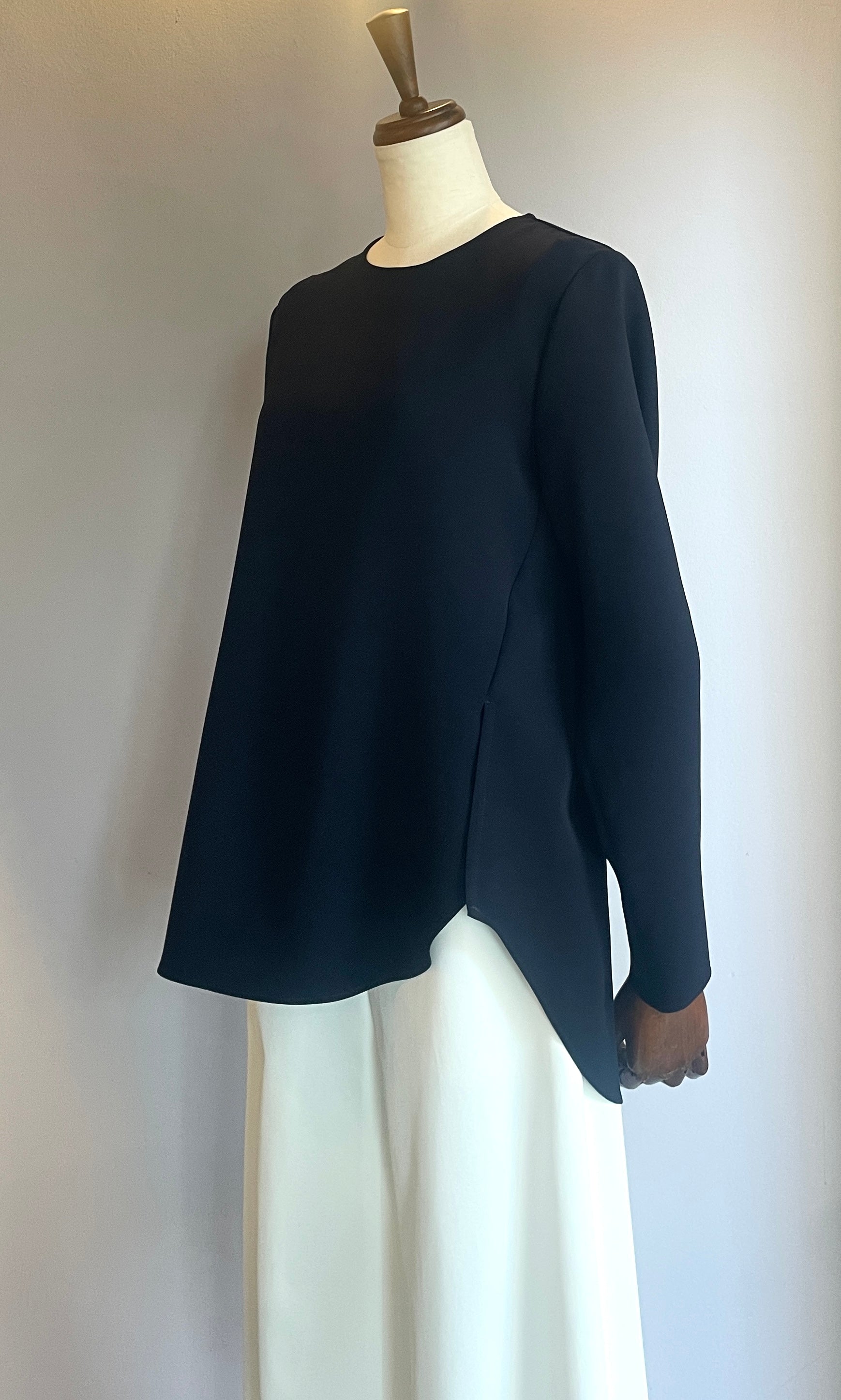 素材はさらっとしていてシワになりづらいトリアセテート素材を使用。前身頃のサイドに施されたスリット部分で前身と後ろ身が重なり合う、シンプルでありながらニュアンスのあるデザインブラウスです。1枚で着ていただいても、ジャケットやジレのインナーとしても活躍します。