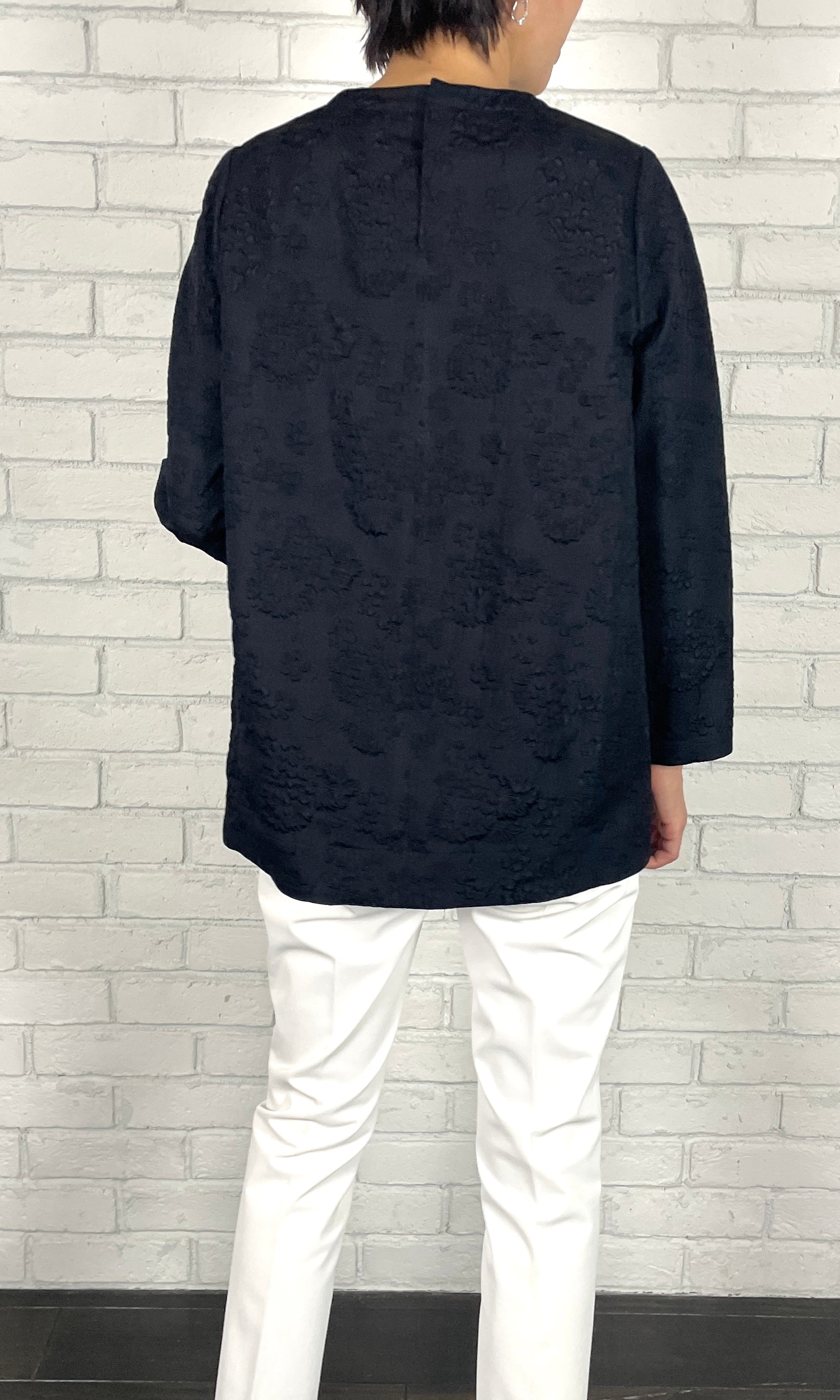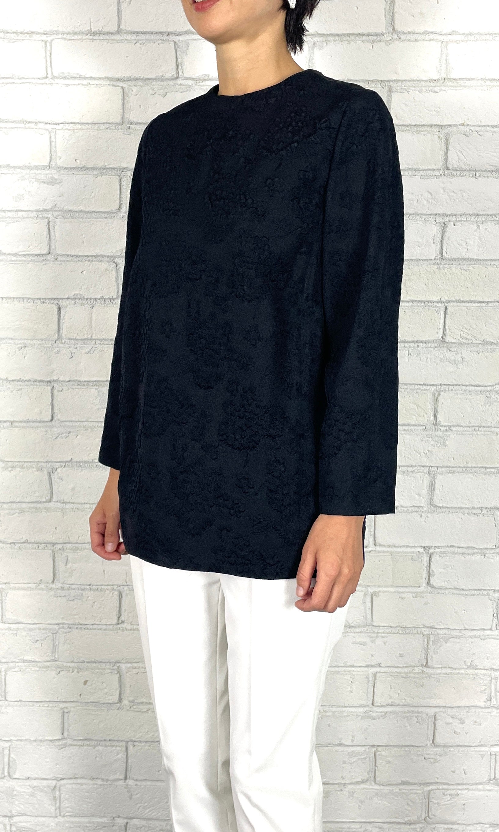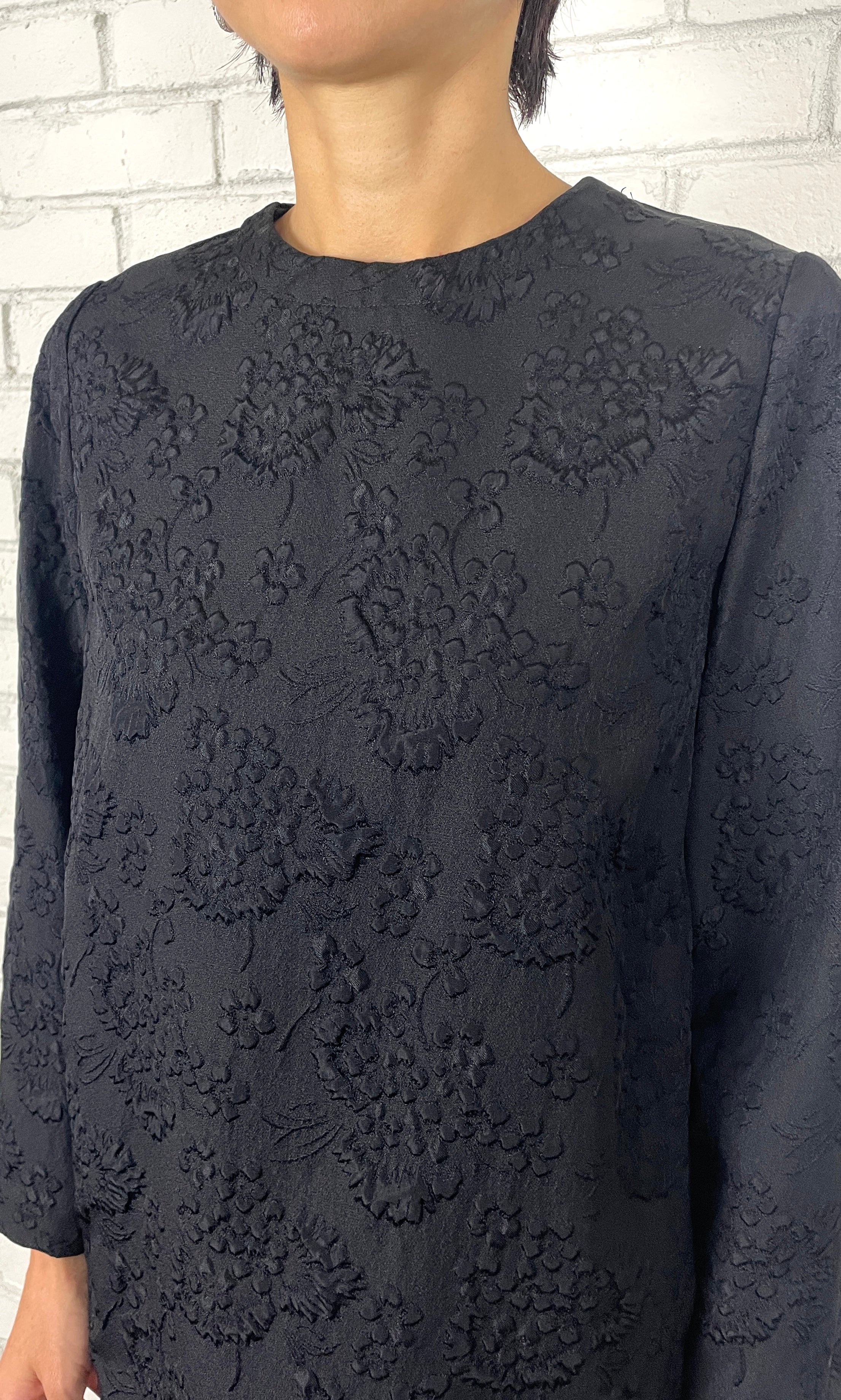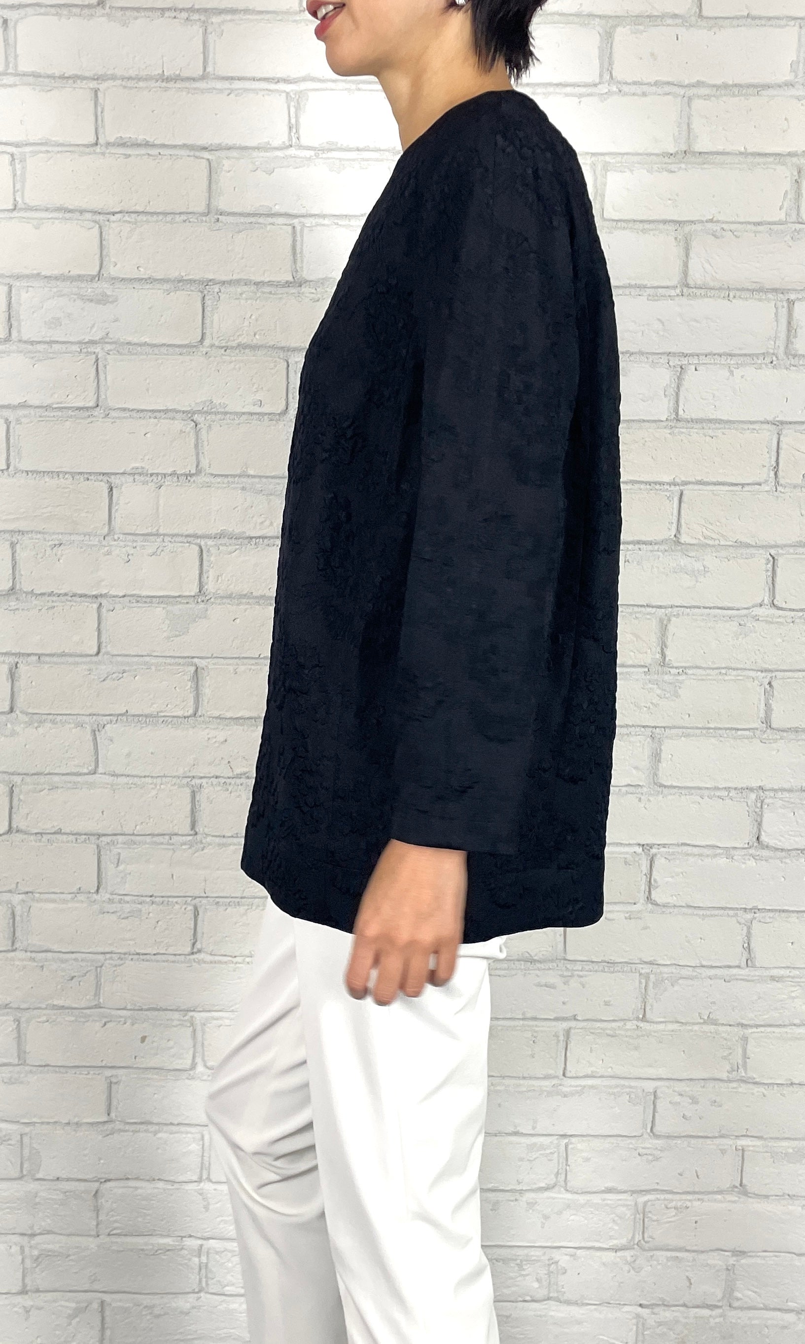 アセテートとポリエステルのフクレJQを使用した、無地見えの生地感。適度なハリがあり、立体的なフラワーモチーフも甘くなりすぎず、上品に着こなしていただけます。