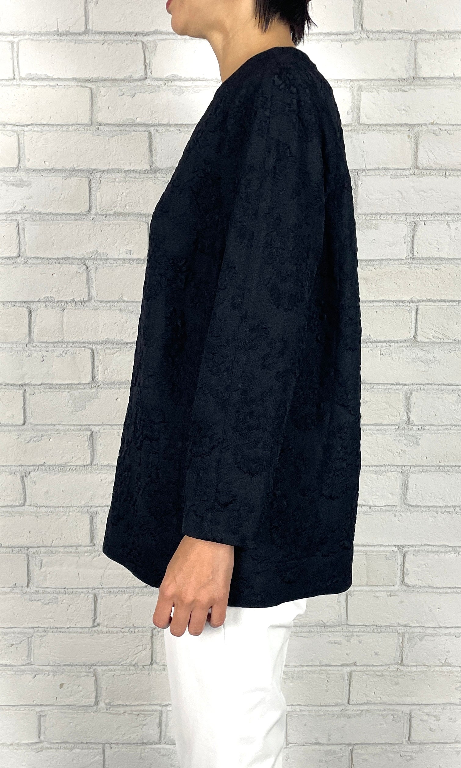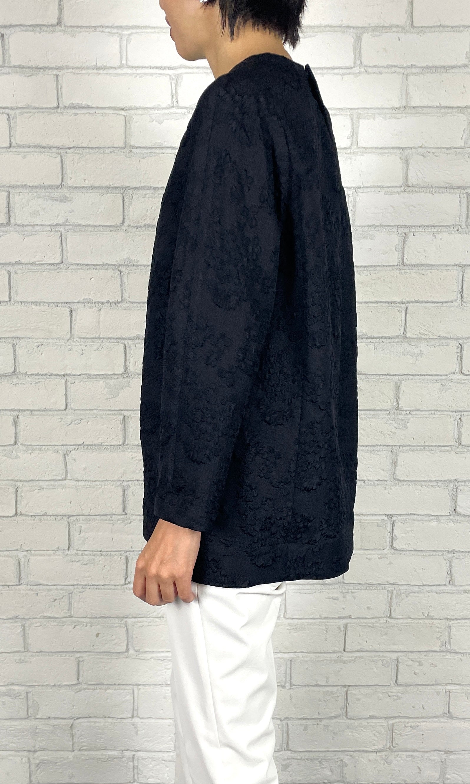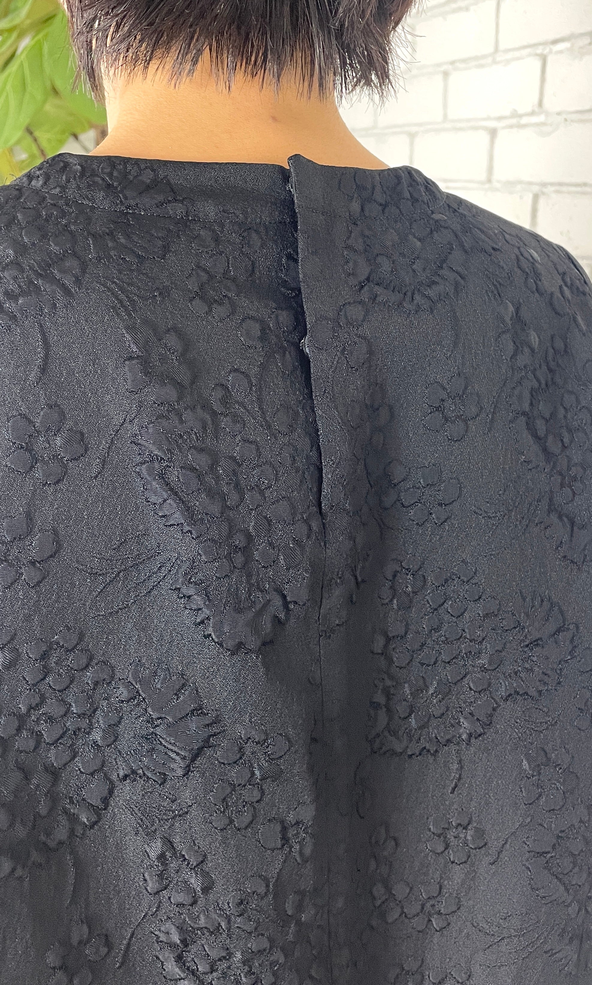 アセテートとポリエステルのフクレJQを使用した、無地見えの生地感。適度なハリがあり、立体的なフラワーモチーフも甘くなりすぎず、上品に着こなしていただけます。