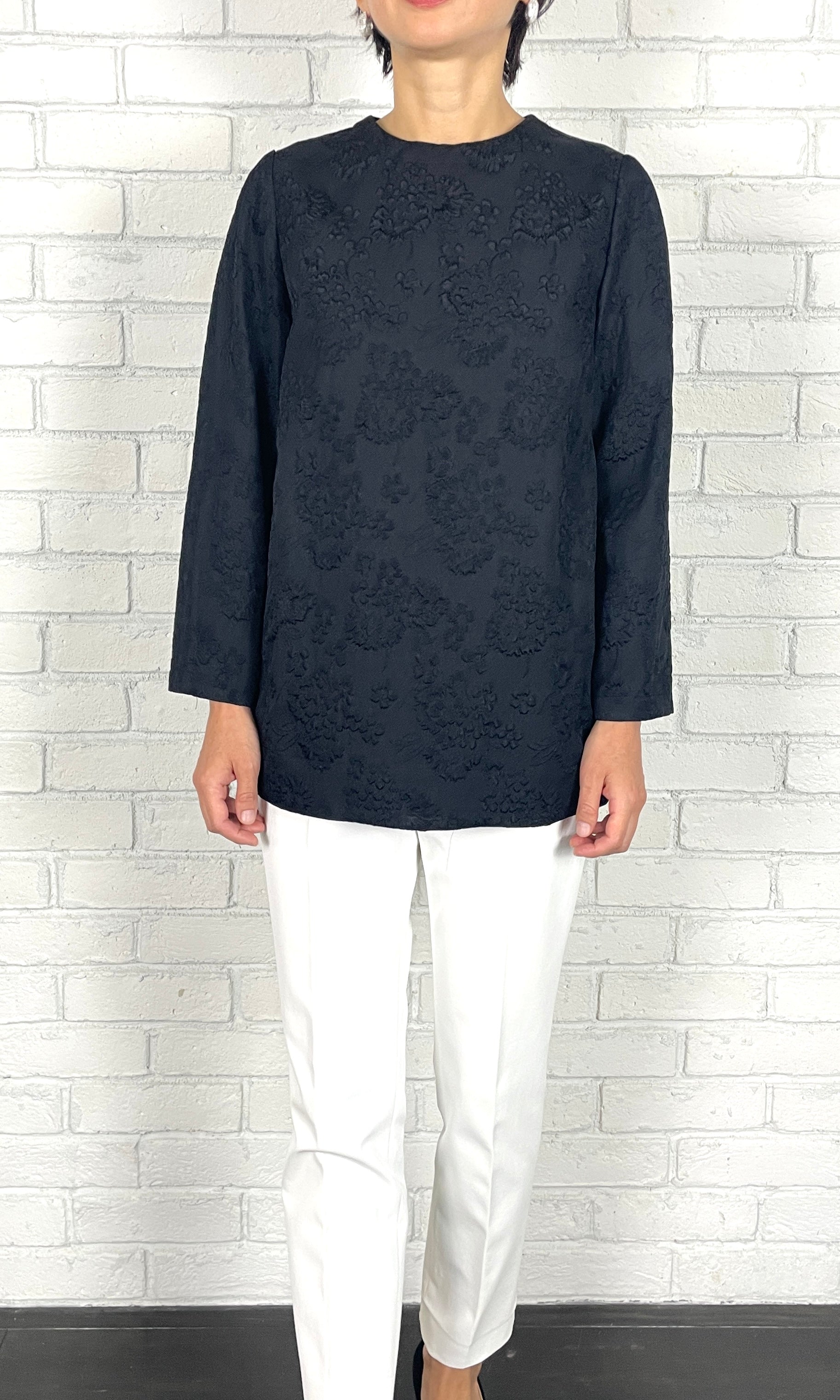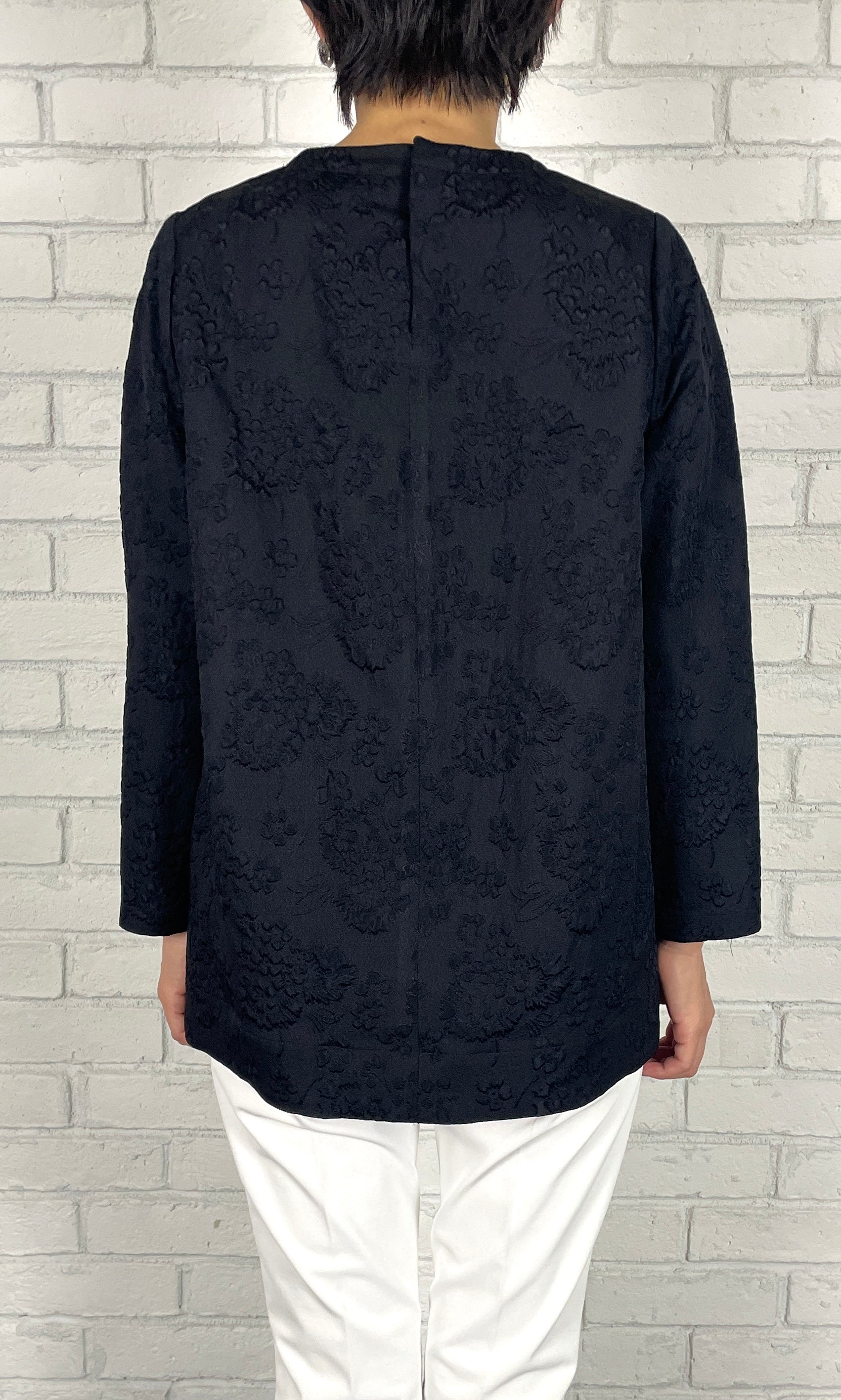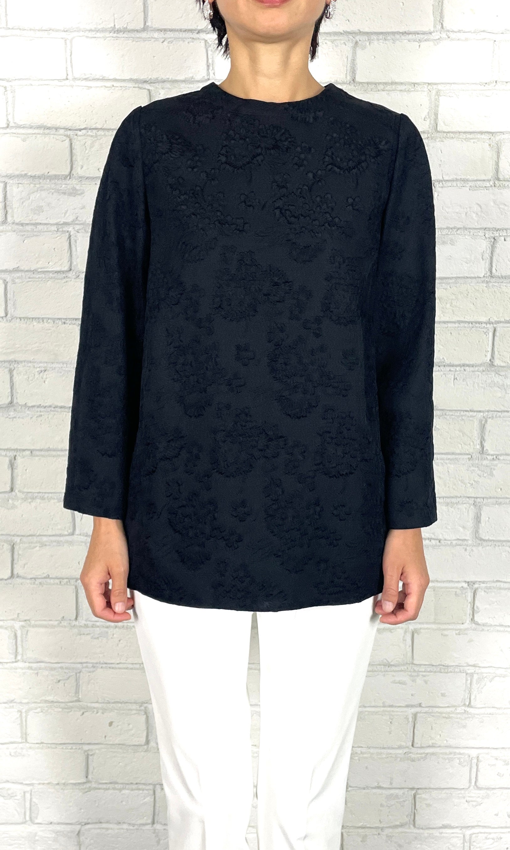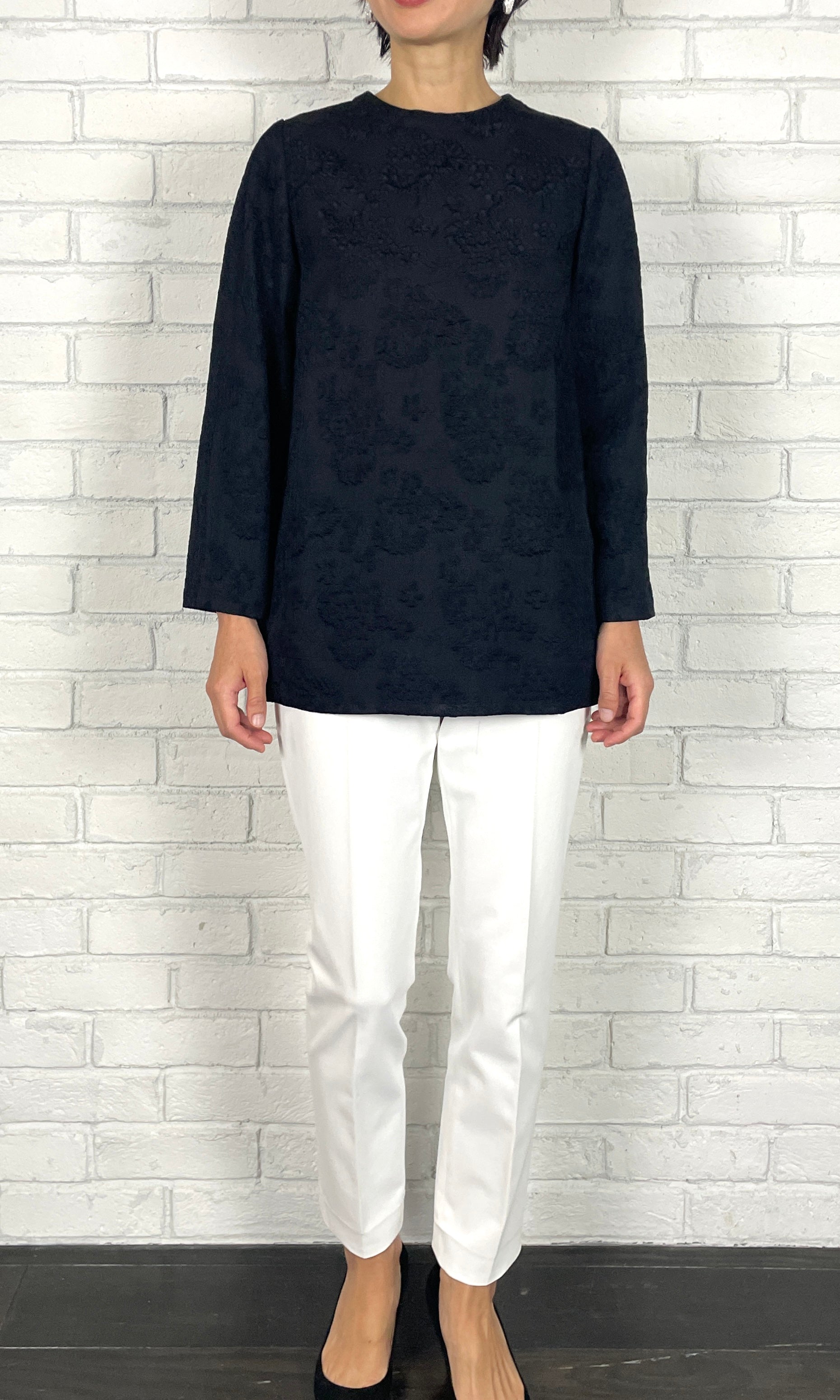 アセテートとポリエステルのフクレJQを使用した、無地見えの生地感。適度なハリがあり、立体的なフラワーモチーフも甘くなりすぎず、上品に着こなしていただけます。