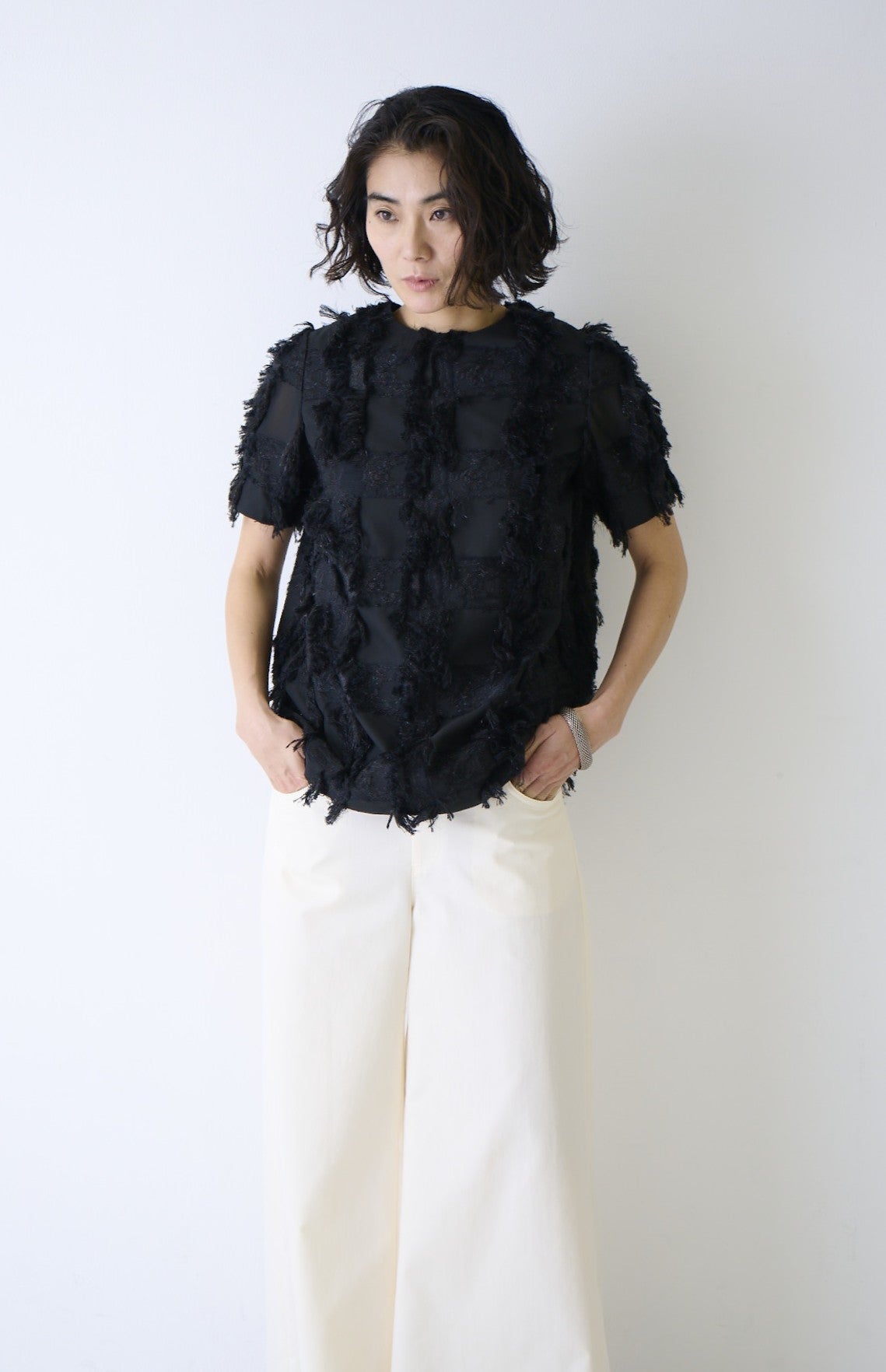 ラメ糸を使用し、大胆に仕上げたカットのボリュームが魅力のジャガードブラウス。ベースをメッシュ組織にすることで透け感が際立ち、ラグジュアリーな印象を演出します。構築的なフォルムブラウスを季節に合わせてアウターと重ねやすいようにワンサイズコンパクトにしました。アウターを羽織った際にチラリとのぞくジャガードの表情が華やかで、インナーブラウスとしても存在感を放ちます。