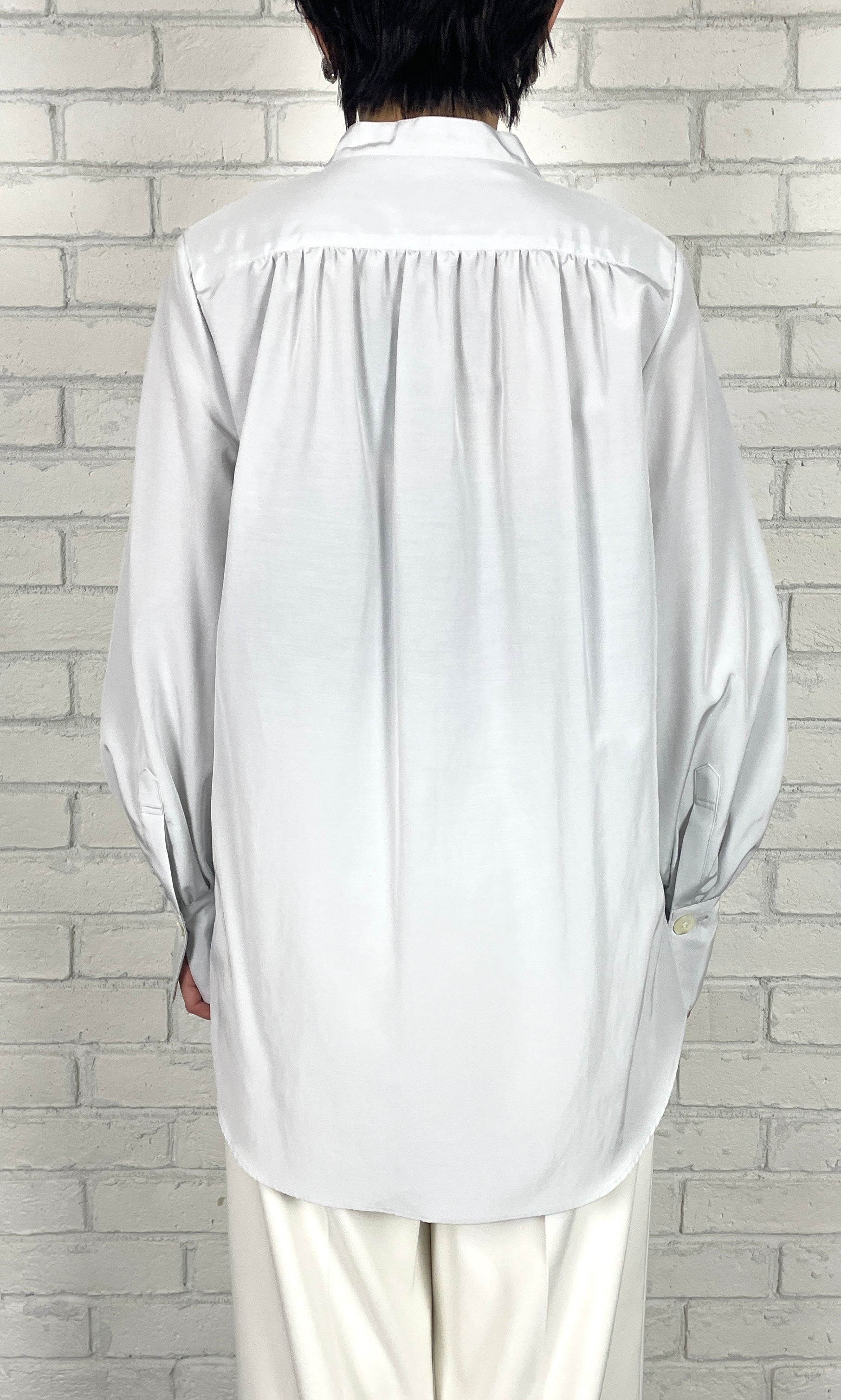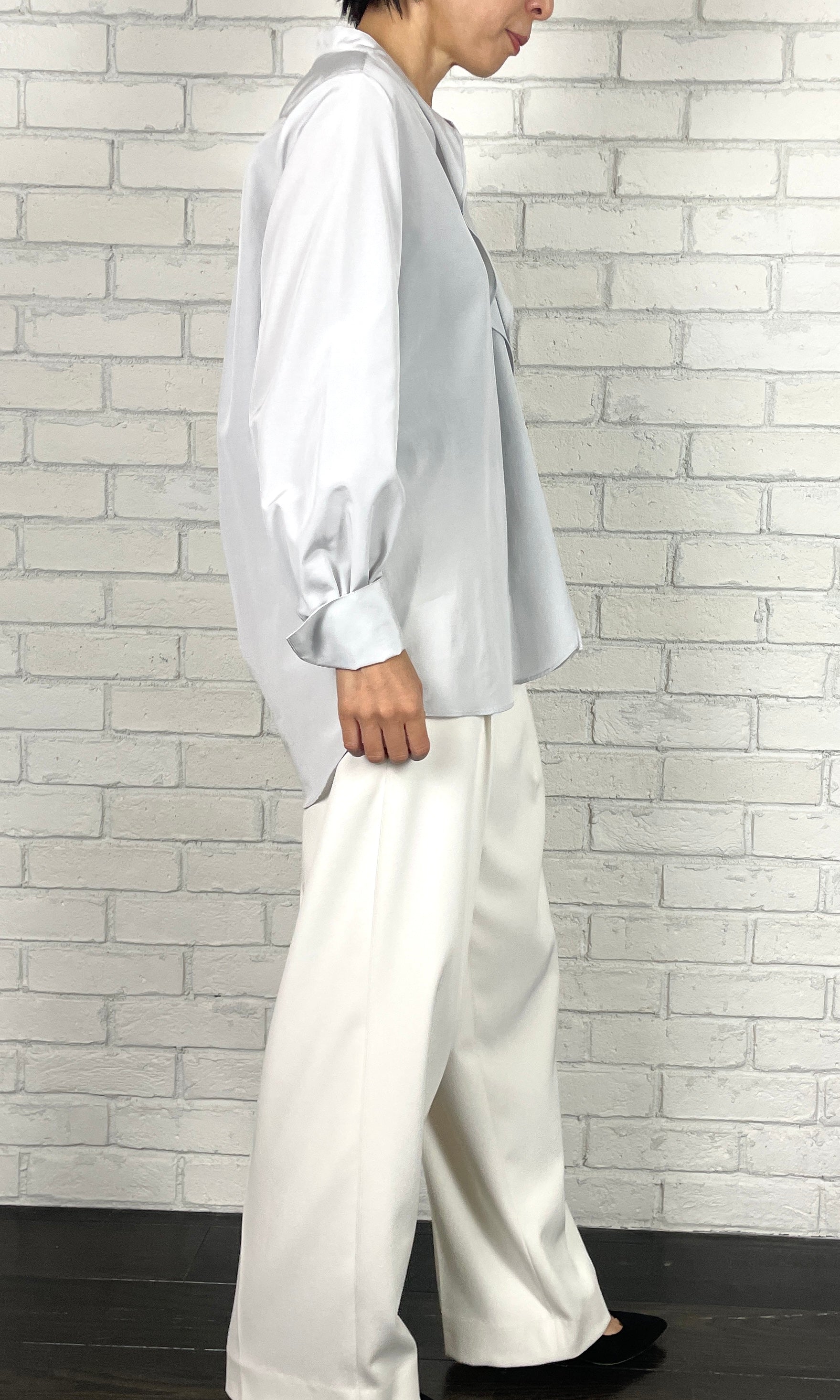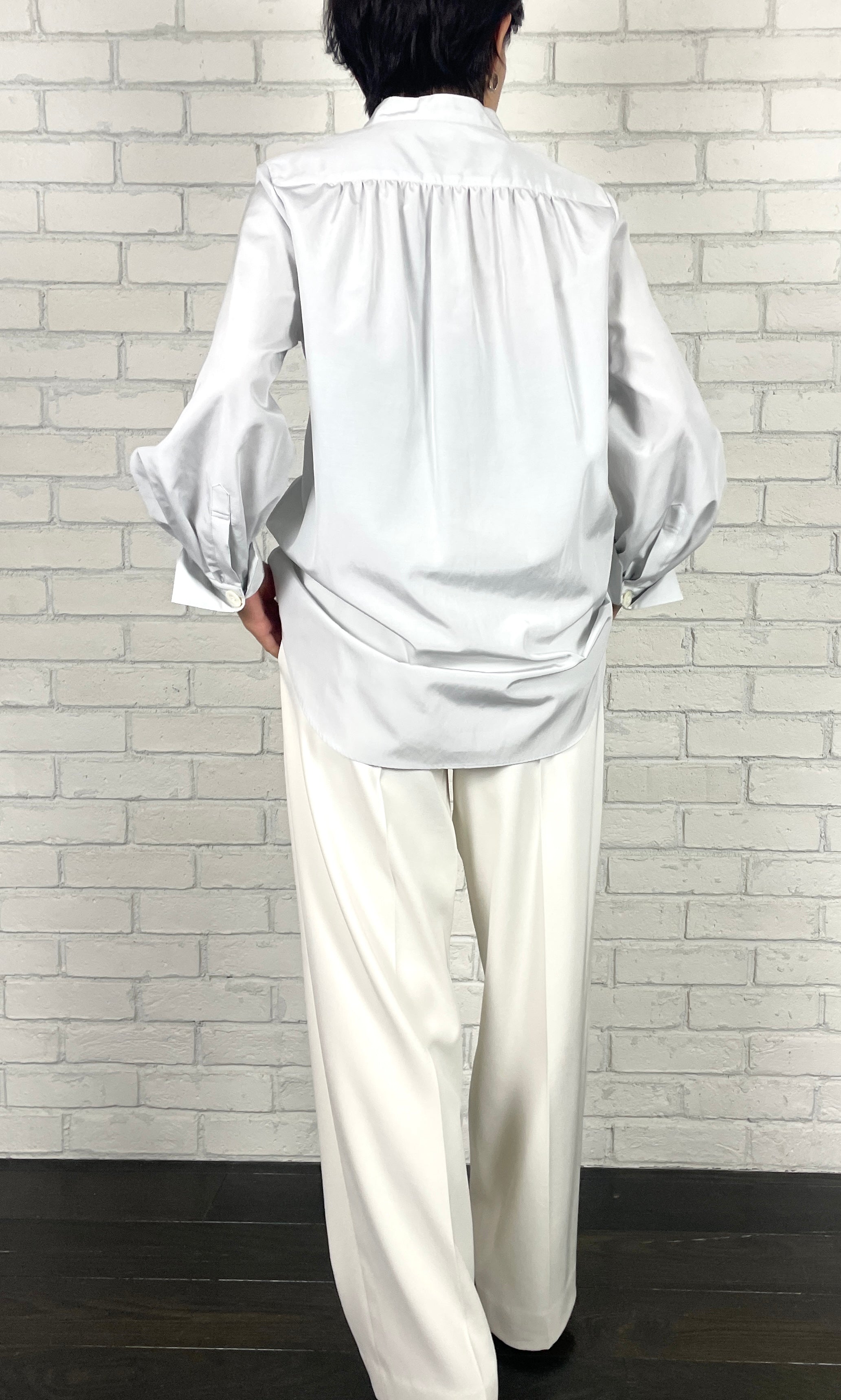 オーガニックコットンとキュプラを高密度に織り込んだタフタ素材。華やかでクールな印象を与えるフリルがポイント。一枚でもしっかりと決まり、ジレやコートの明きからフリルを覗かせて着ていただくのがおススメです。