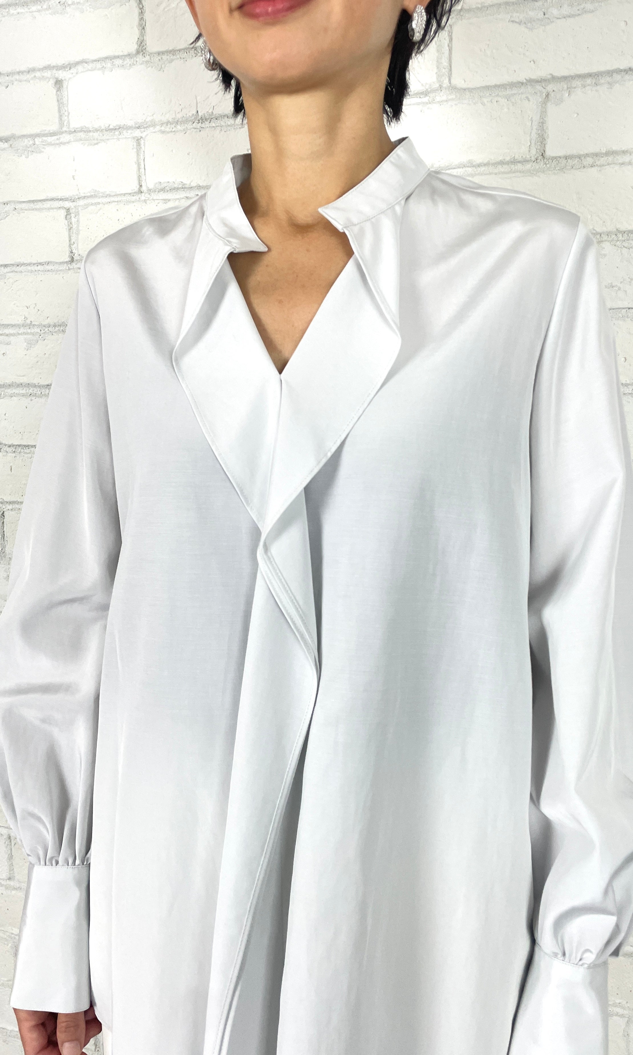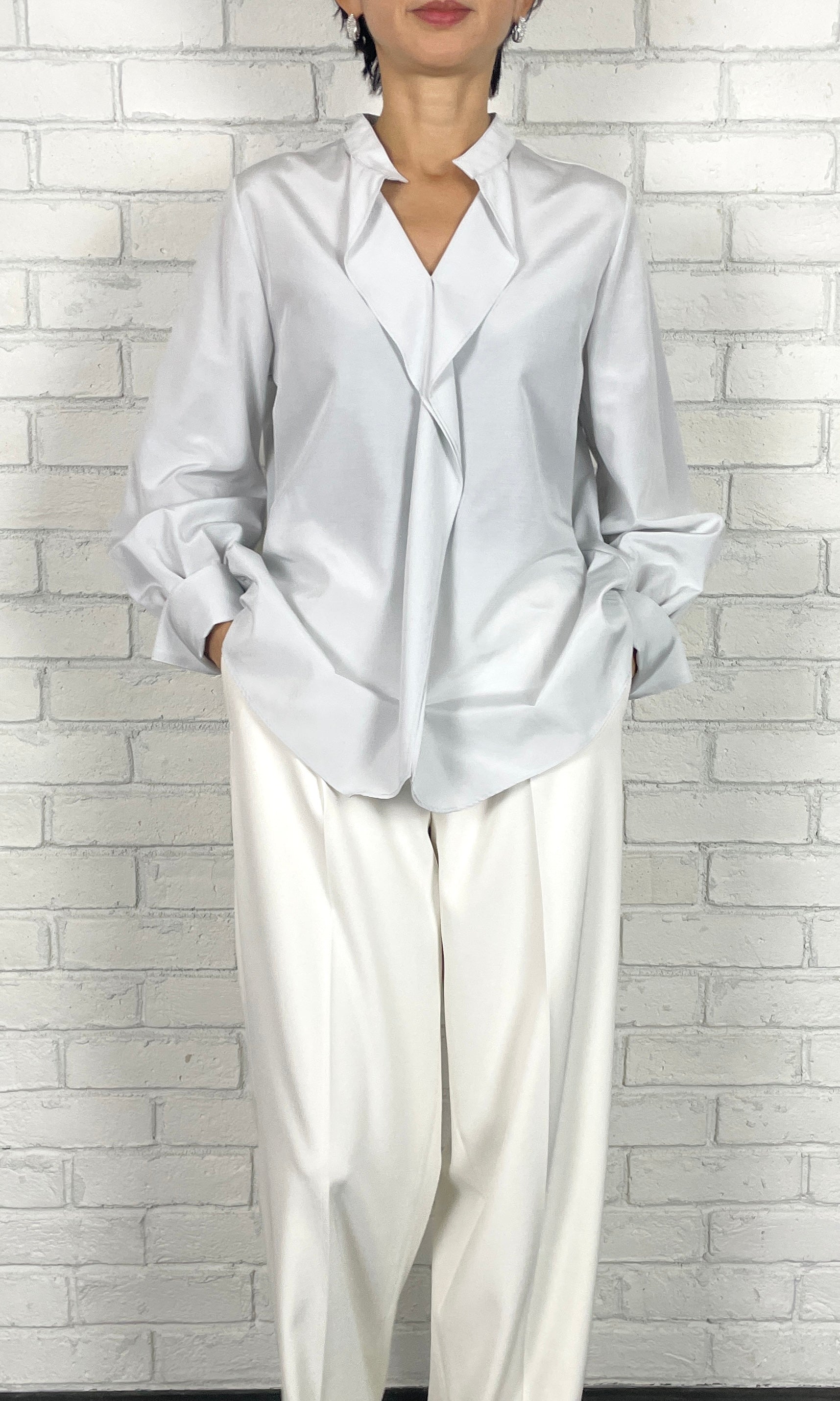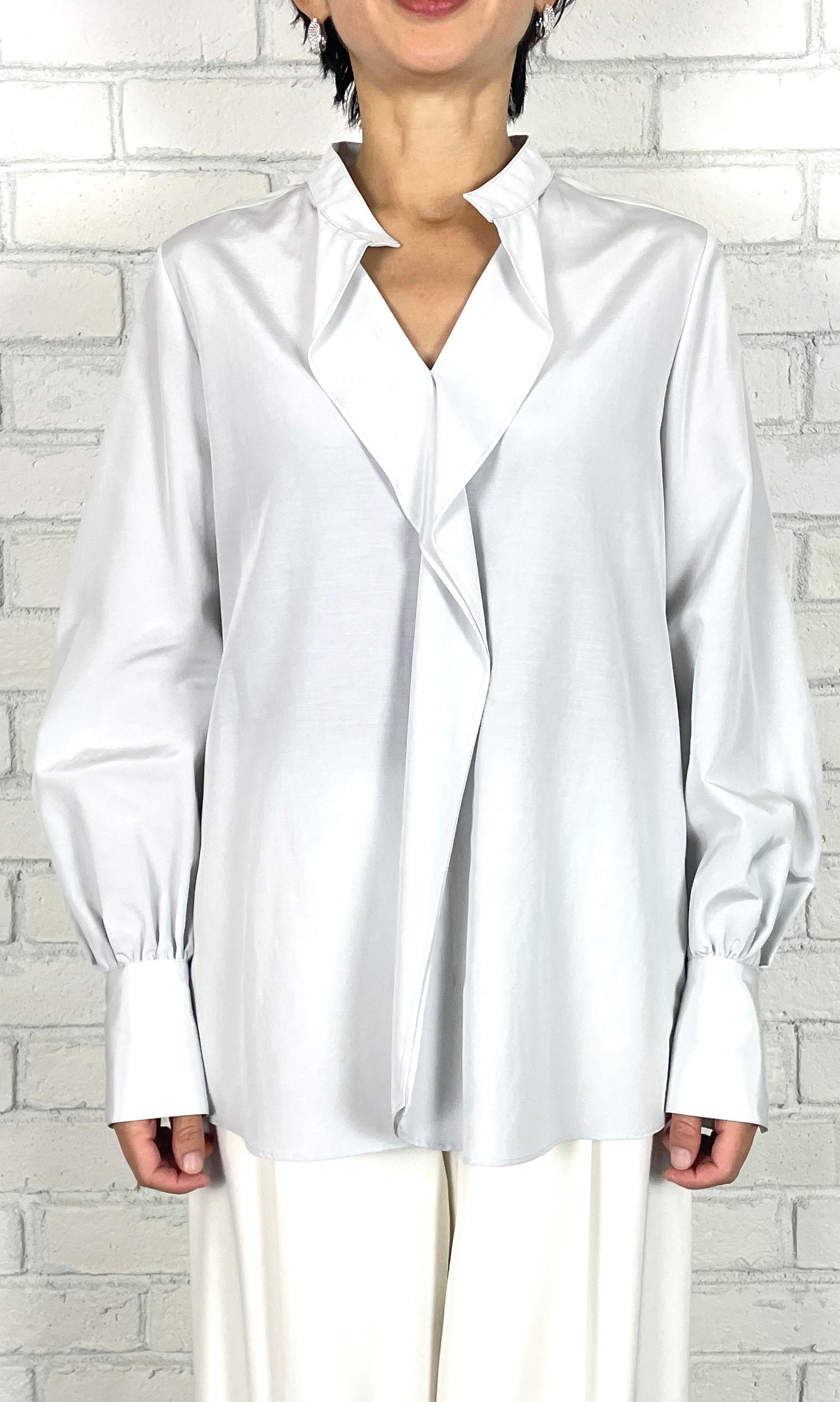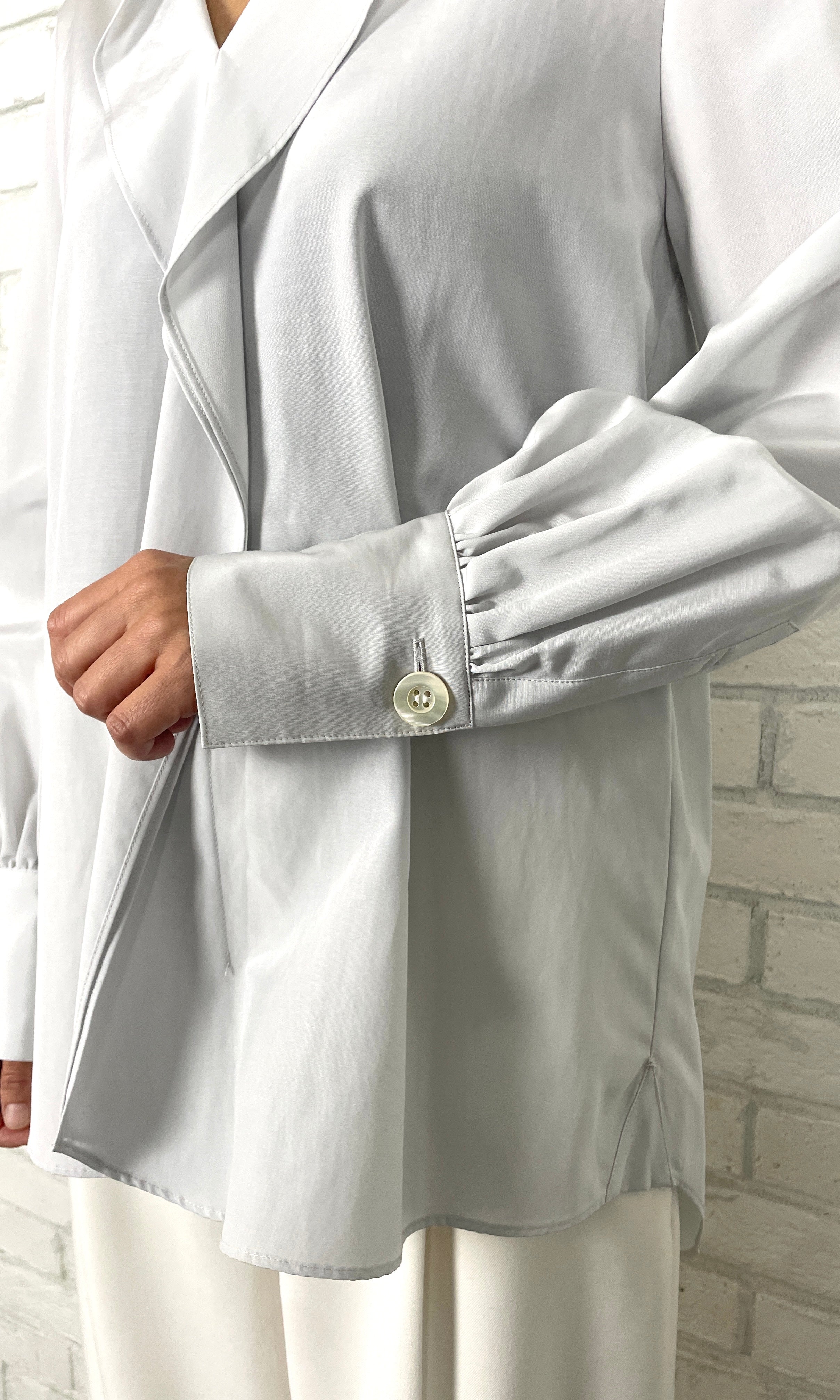 オーガニックコットンとキュプラを高密度に織り込んだタフタ素材。華やかでクールな印象を与えるフリルがポイント。一枚でもしっかりと決まり、ジレやコートの明きからフリルを覗かせて着ていただくのがおススメです。