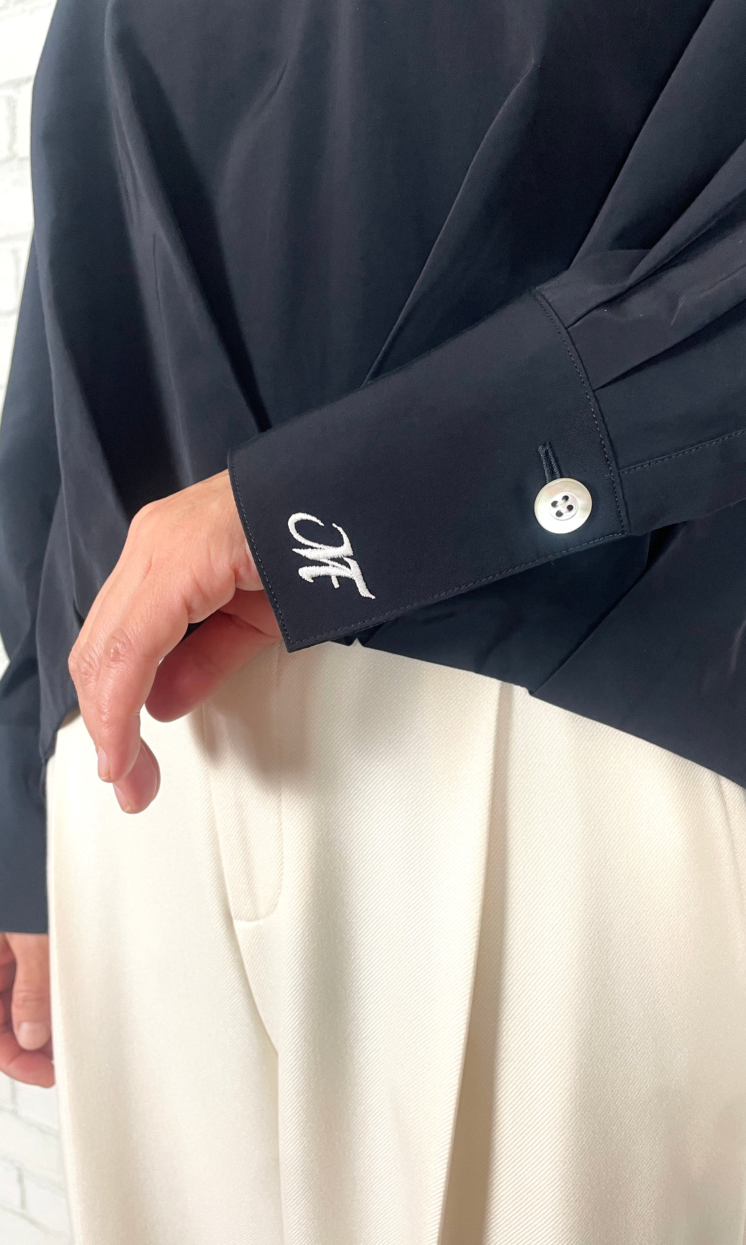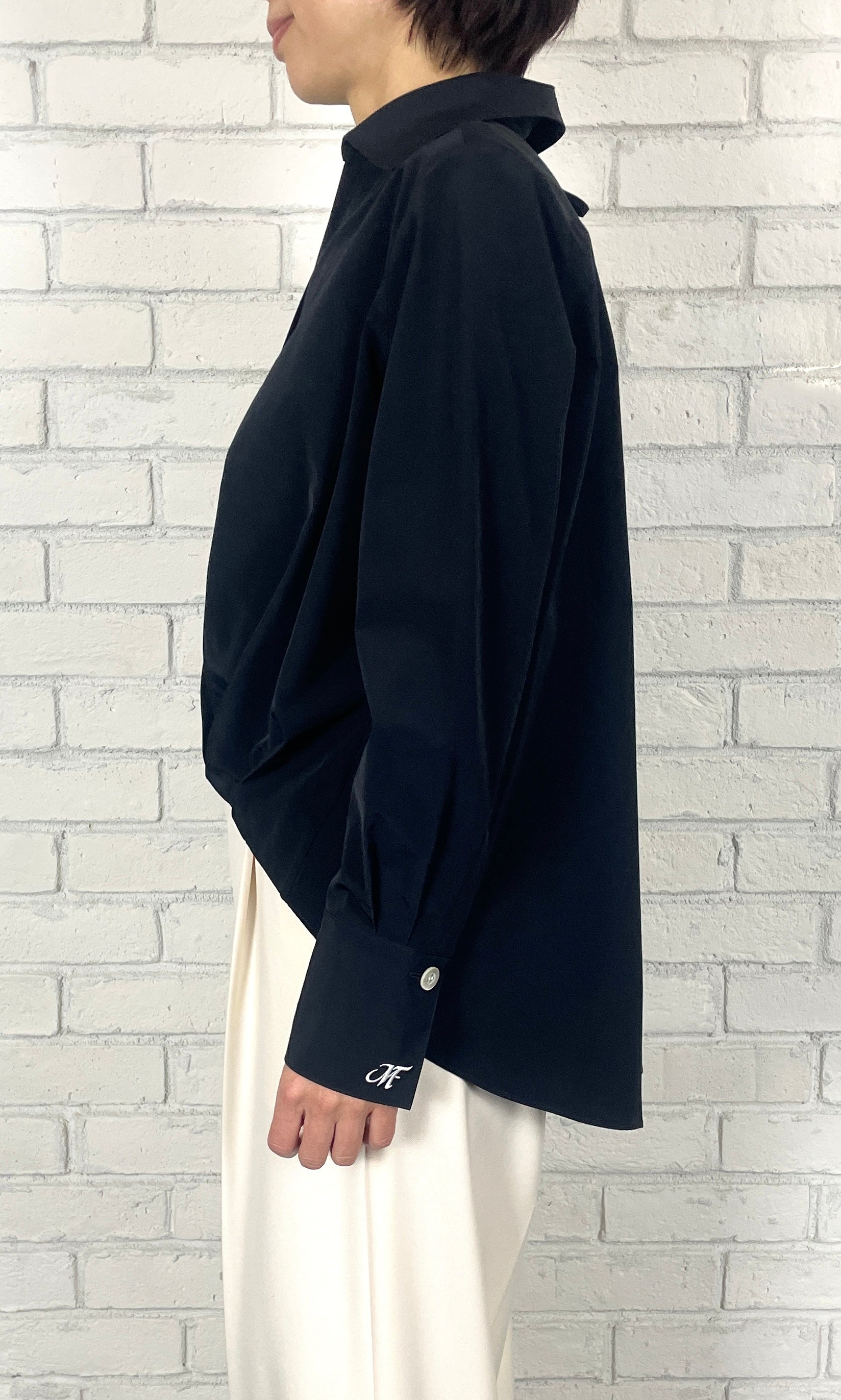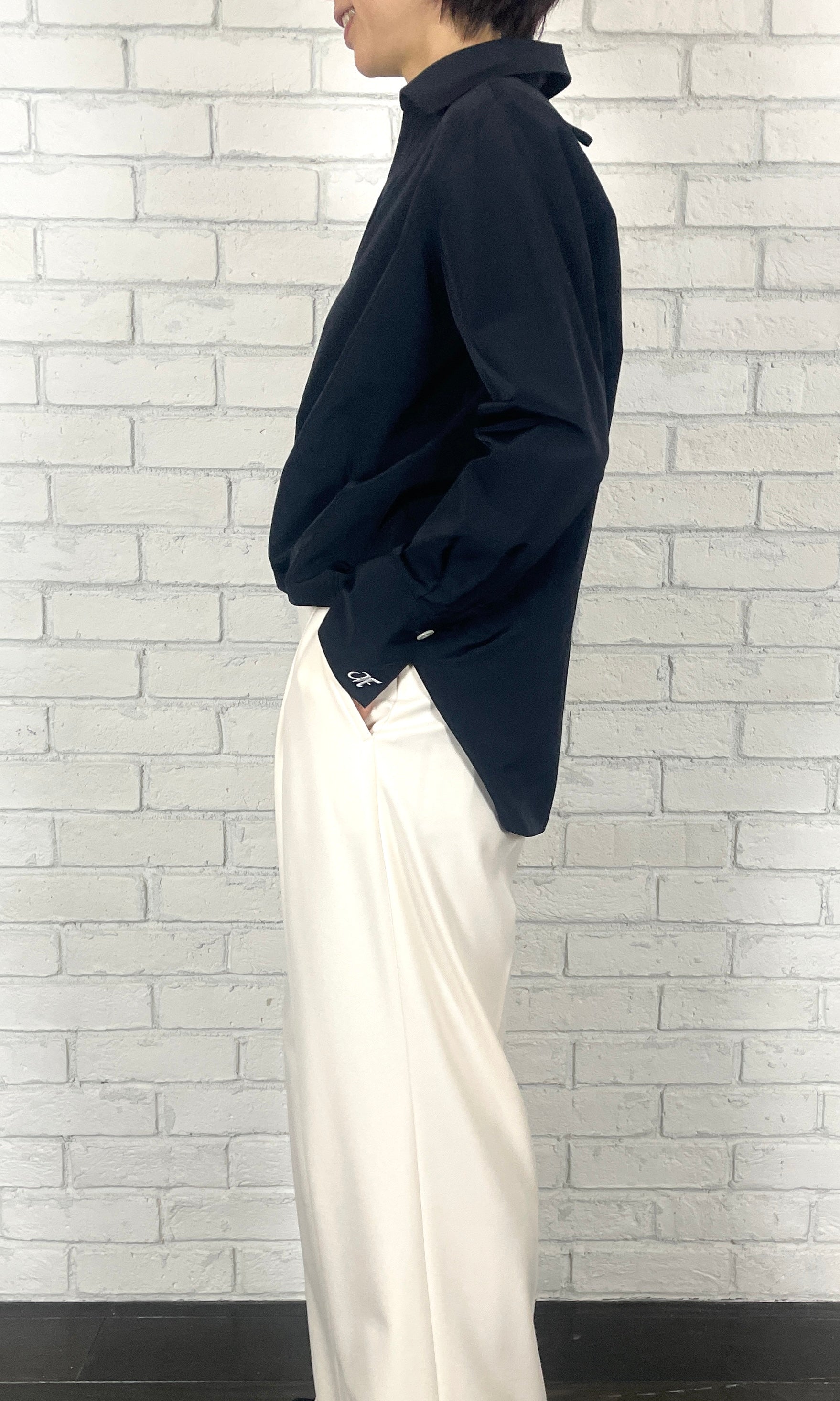 トリアセ特有の適度なハリ感と光沢感、綿のナチュラル感を融合し、両方の良さを掛け合わせた素材。前身頃の裾に施したタックがフォルムを形づくり、360度立体的な表情を演出。ウエストインしたような見え方で、大胆な前後差もエレガントに映ります。カフスにはエムフィルのロゴ刺繍を施し、遊び心のある仕上がりに。