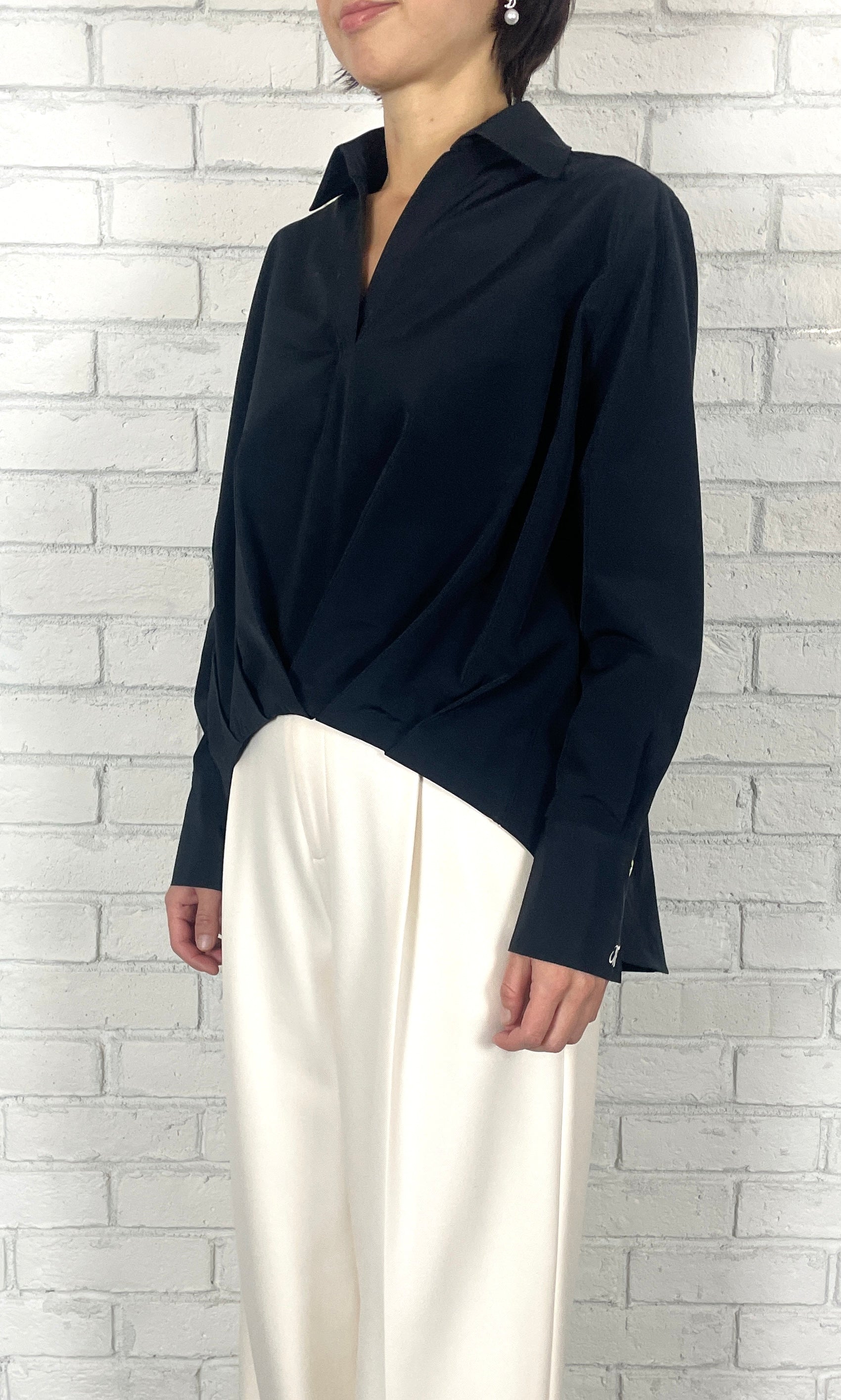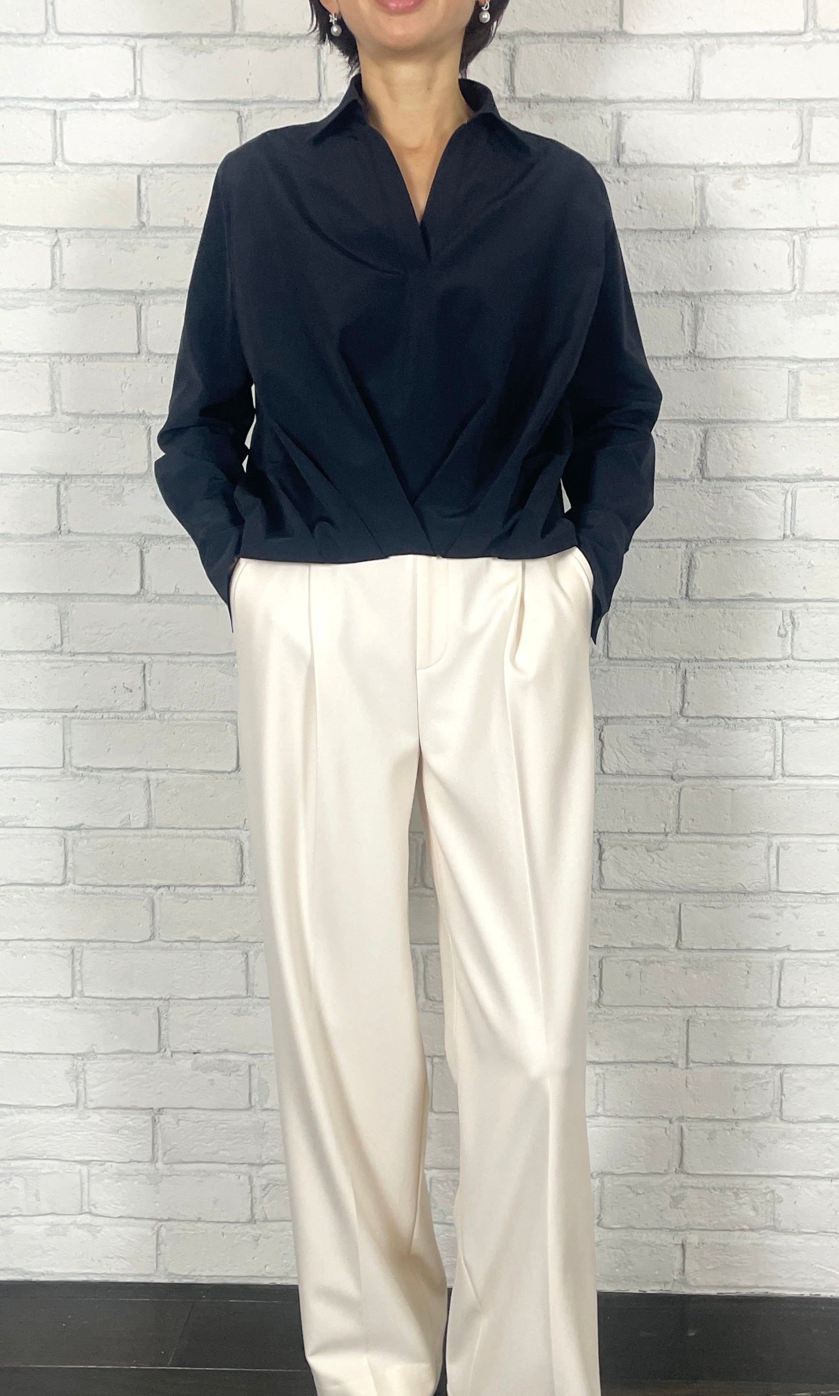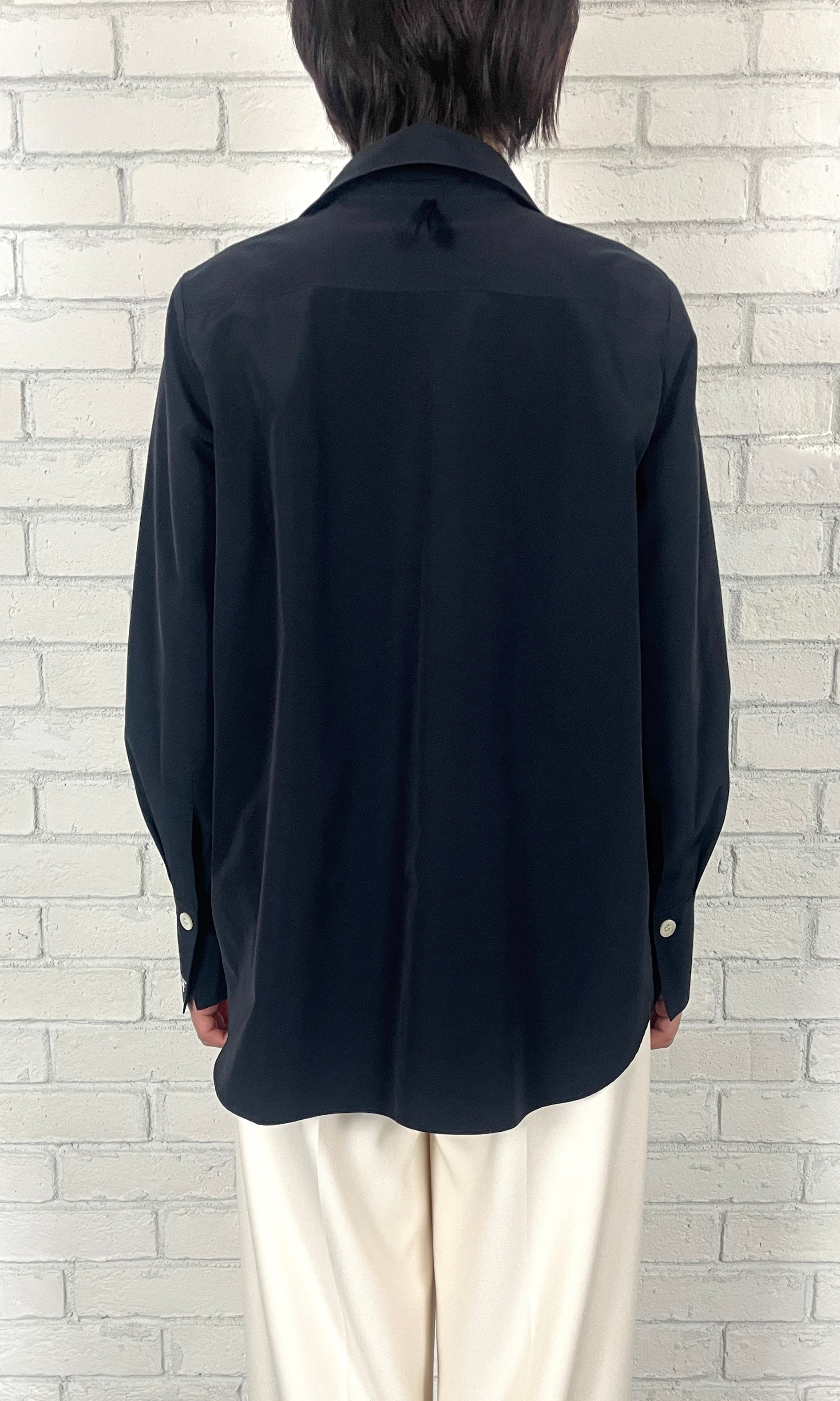 トリアセ特有の適度なハリ感と光沢感、綿のナチュラル感を融合し、両方の良さを掛け合わせた素材。前身頃の裾に施したタックがフォルムを形づくり、360度立体的な表情を演出。ウエストインしたような見え方で、大胆な前後差もエレガントに映ります。カフスにはエムフィルのロゴ刺繍を施し、遊び心のある仕上がりに。